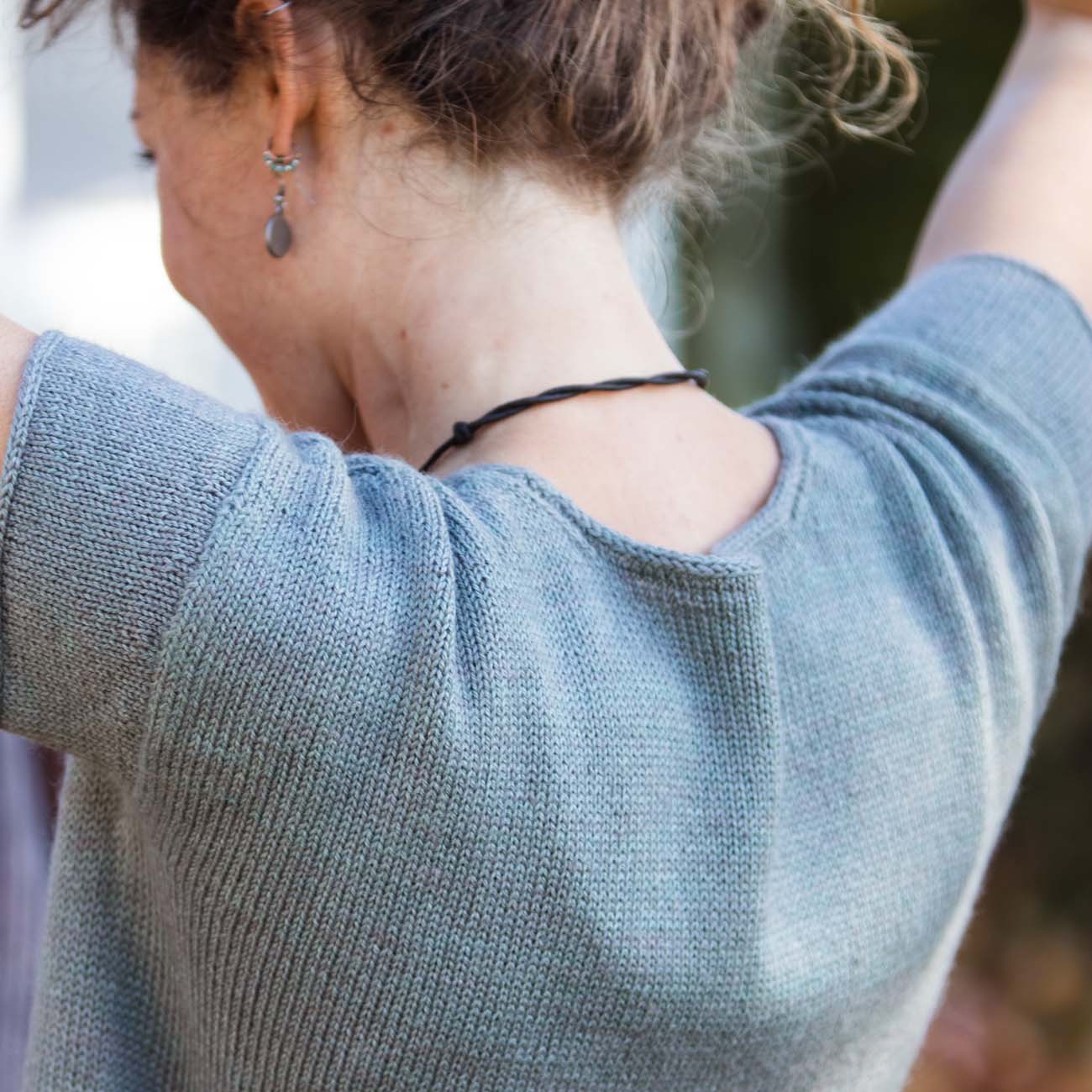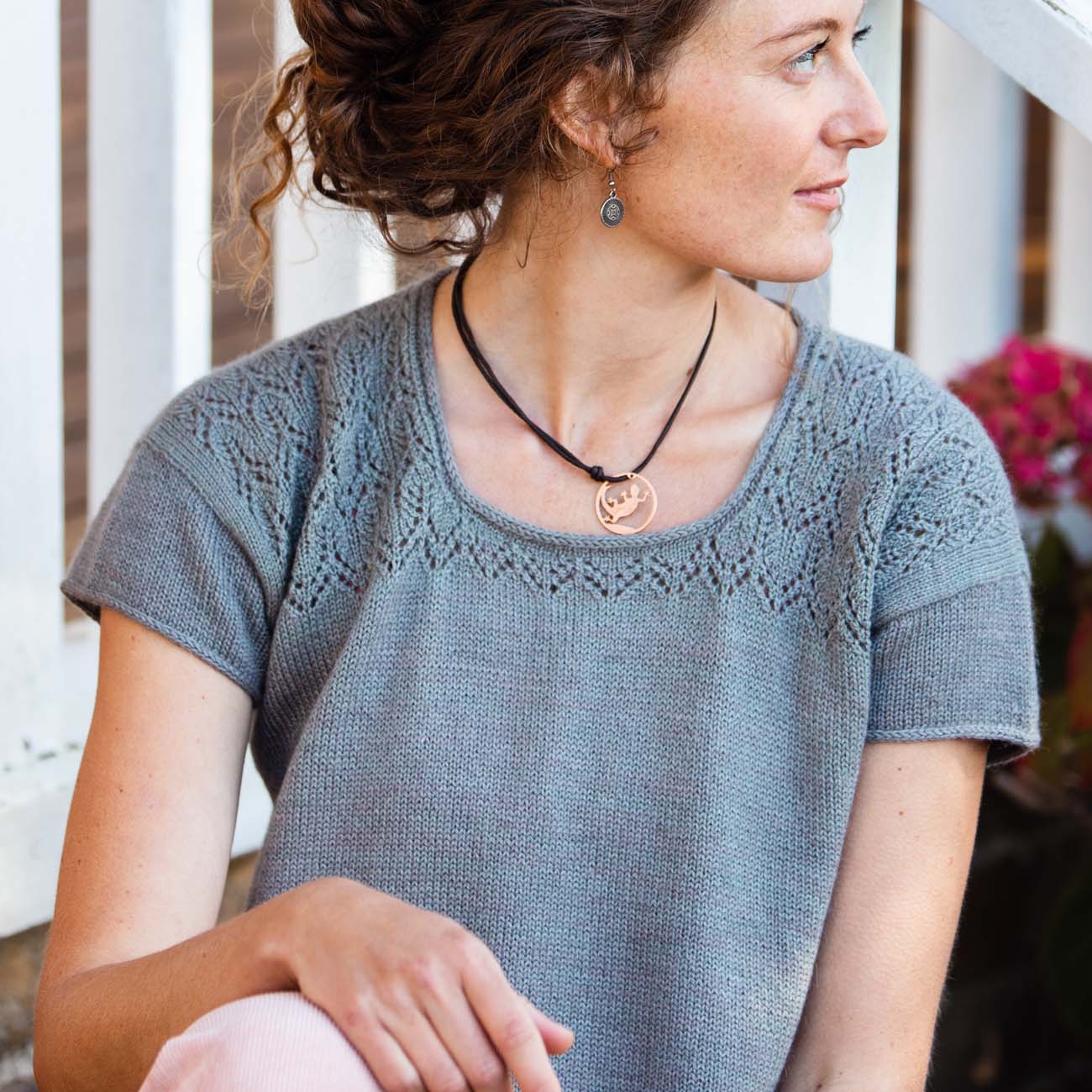 Newlands is a cropped t-shirt with a pretty band of lace across the neck and shoulders. It is knitted seamlessly from the bottom-up with neat i-cord edgings at the hem, sleeves and neck.