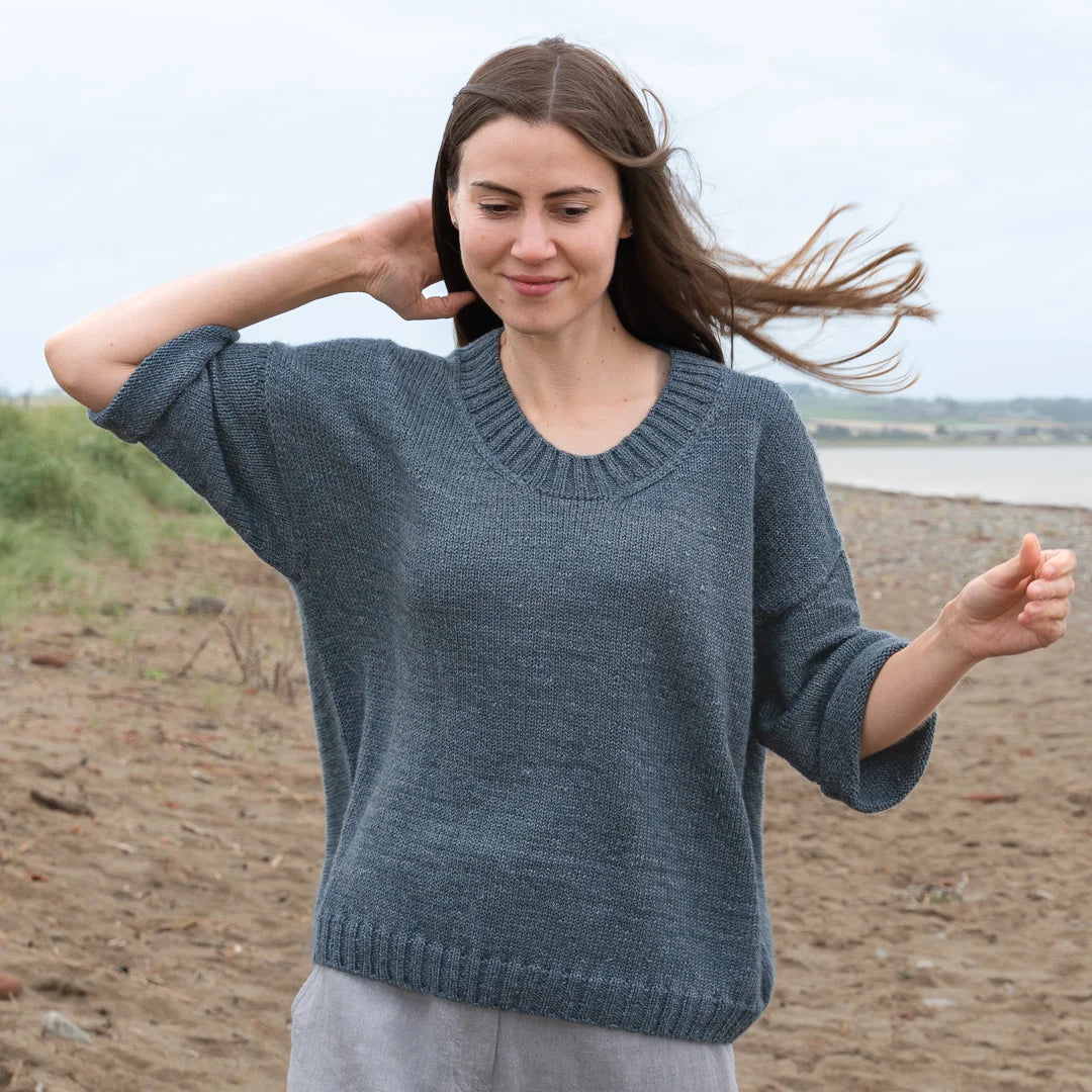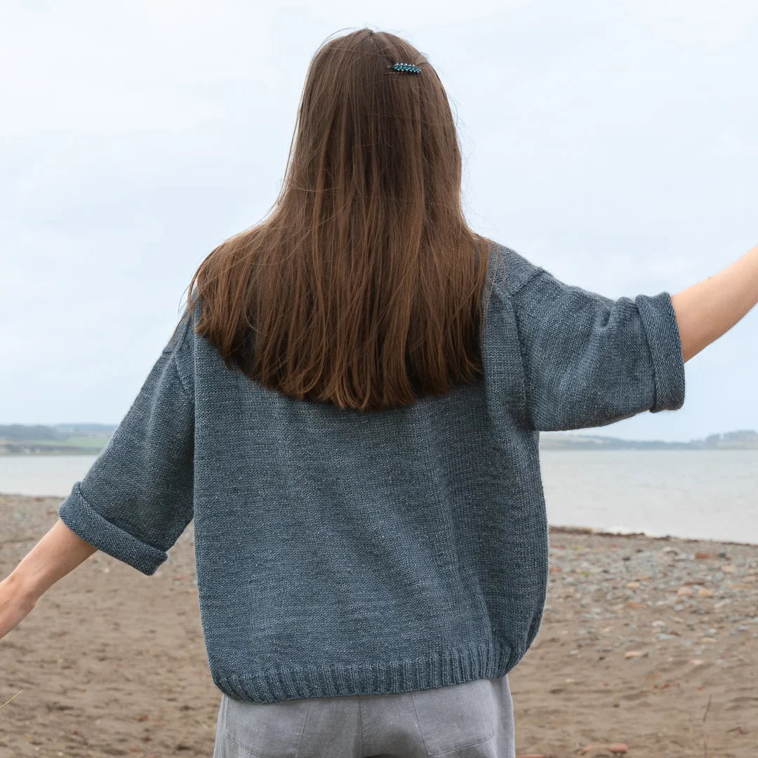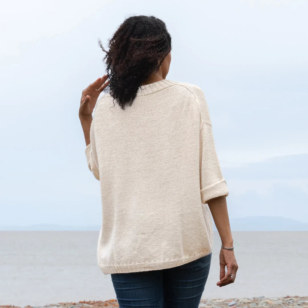 The Ocean Blooms Sweater is the epitome of elegant simplicity combined with subtle coastal inspiration. With its relaxed fit, dropped shoulders, wide neckline, and three-quarter-length sleeves, this top-down knit has the right amount of technique to challenge the adventurous beginner while offering advanced knitters a relaxing experience. Designed in The Fibre Co.’s Acadia, a luxurious blend of Merino, baby alpaca and silk noil, the sweater has a graceful drape and soft texture that feels exquisite against the skin.