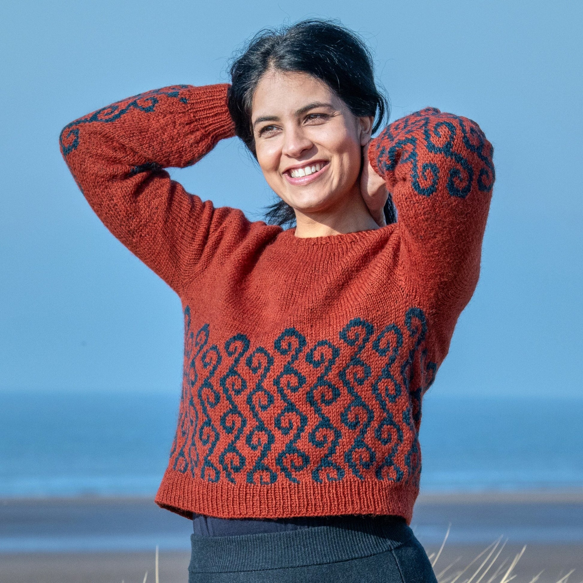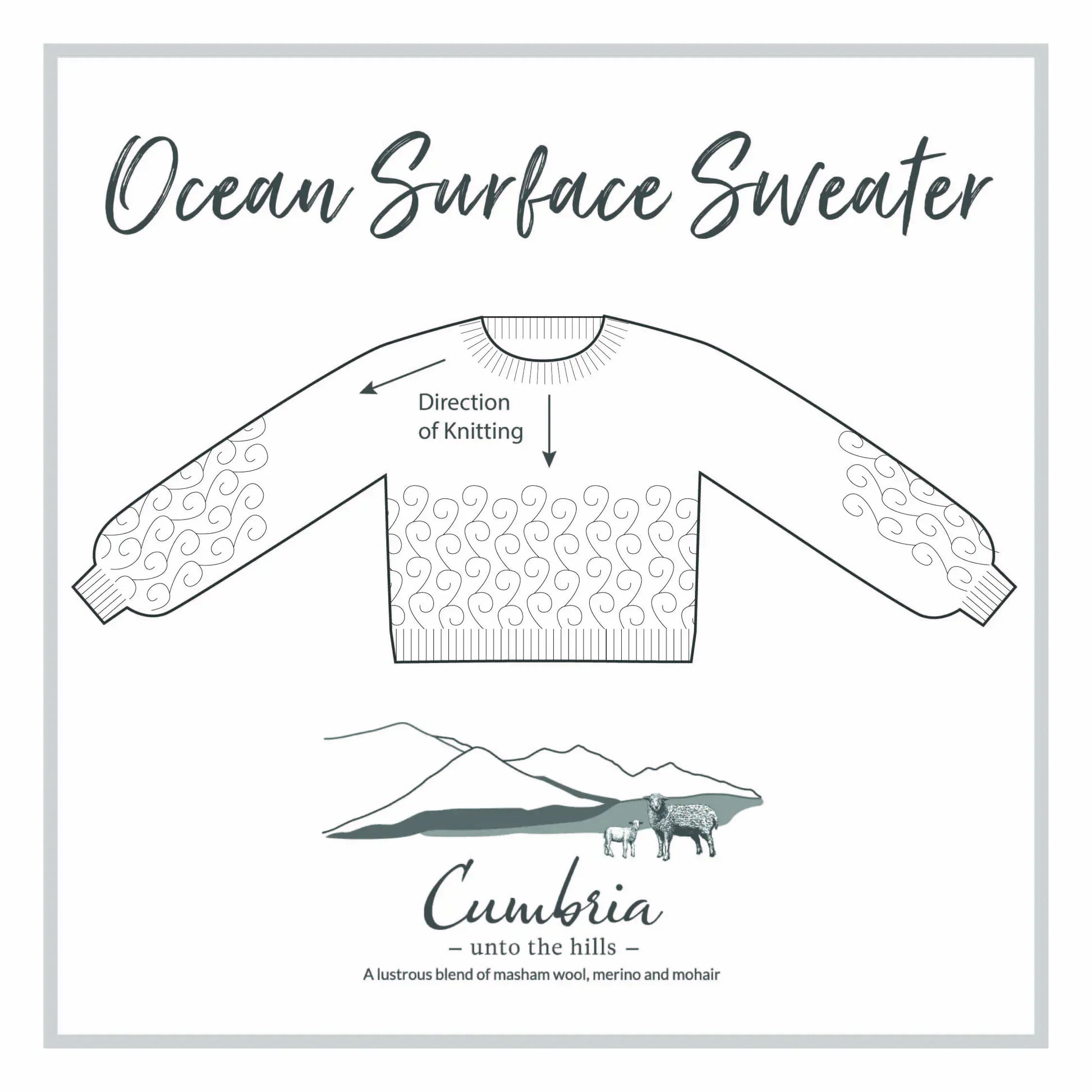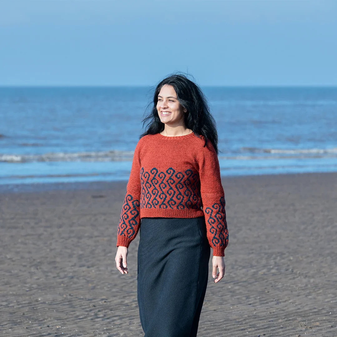 This stylish cropped sweater features a graphic swirling spiral pattern and perfectly puffed sleeves. Knitted top-down seamlessly in the round, the yoke is worked to the underarm where the work divides, and the sleeves are separated from the body. Inspired by the ocean and the current fashion industry, Ocean Surface Sweater is a stunning garment for special occasions and everyday activities alike.