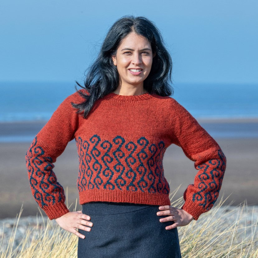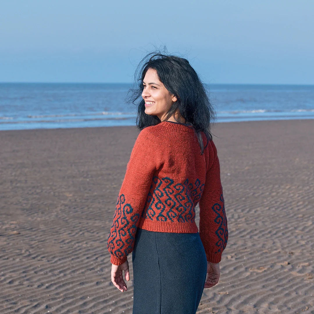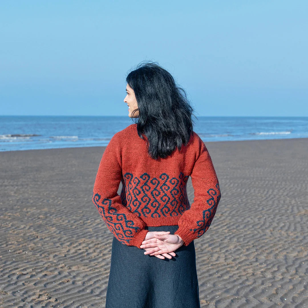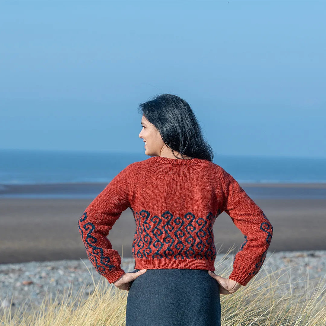 This stylish cropped sweater features a graphic swirling spiral pattern and perfectly puffed sleeves. Knitted top-down seamlessly in the round, the yoke is worked to the underarm where the work divides, and the sleeves are separated from the body. Inspired by the ocean and the current fashion industry, Ocean Surface Sweater is a stunning garment for special occasions and everyday activities alike.