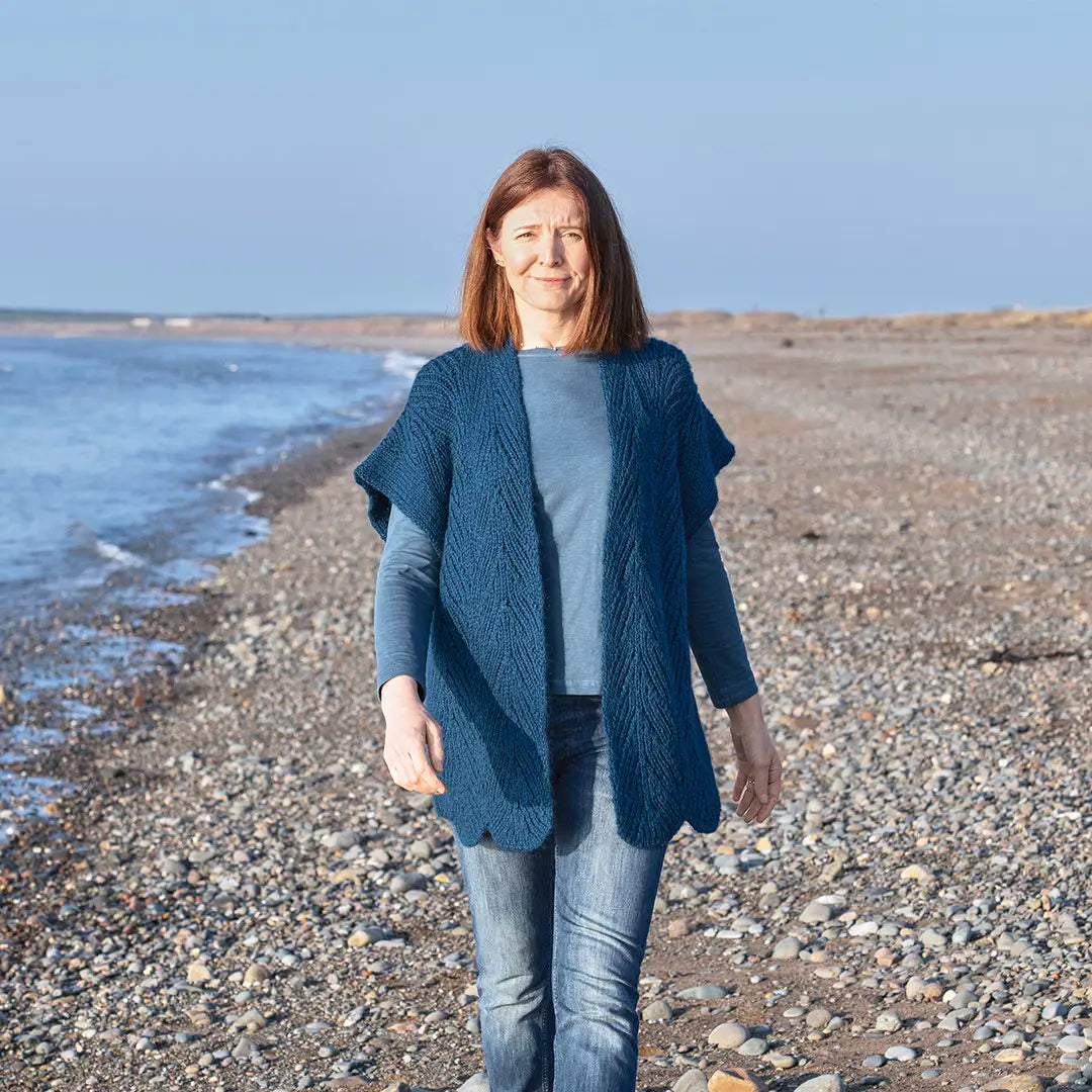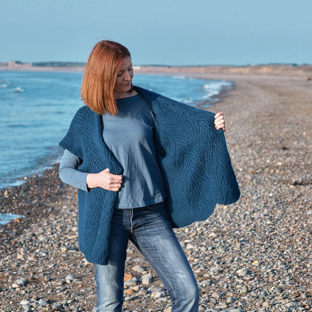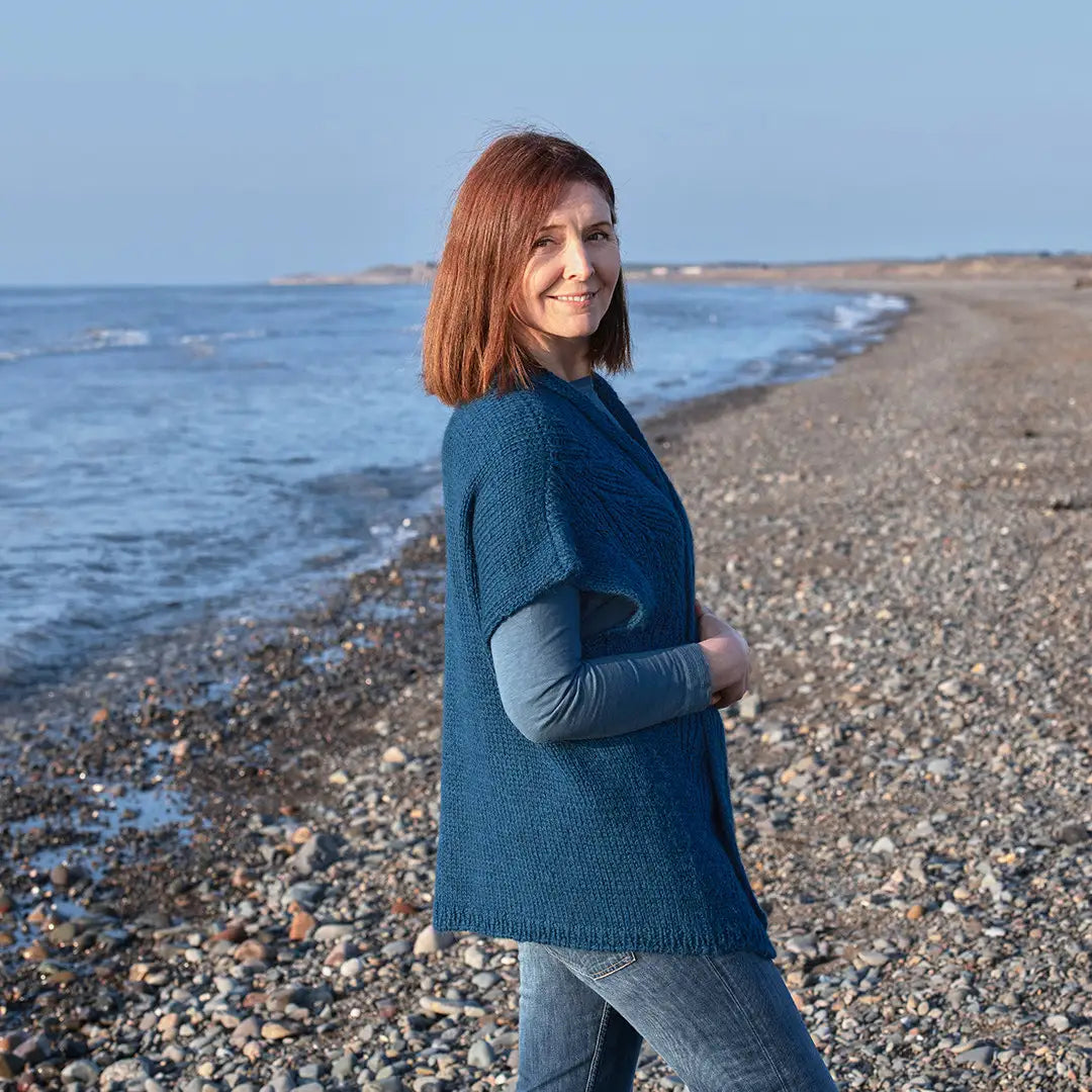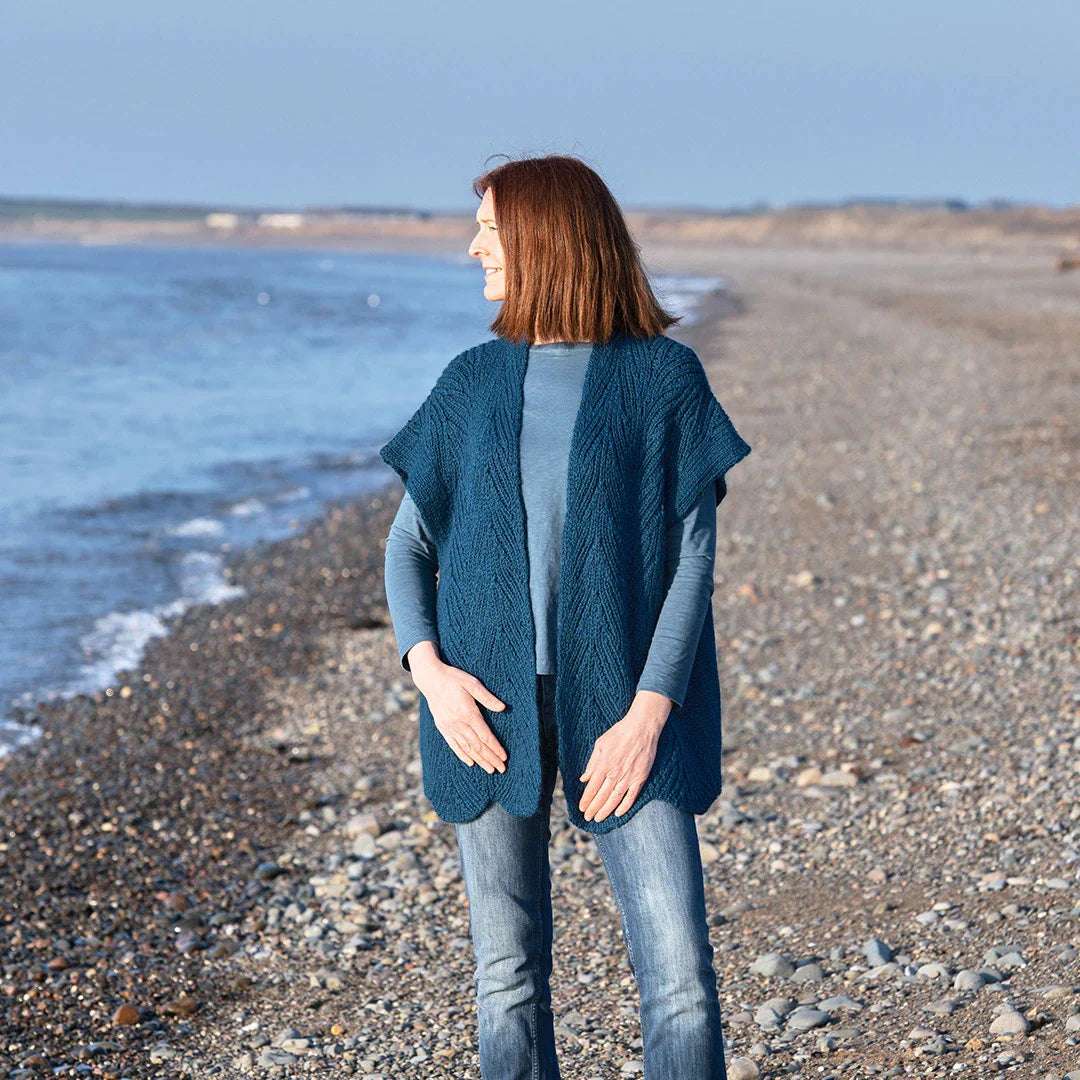 Pelagic means ‘of the open sea’ and is the design inspiration for this cozy sleeveless cardigan