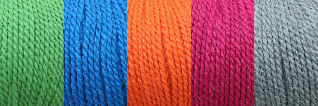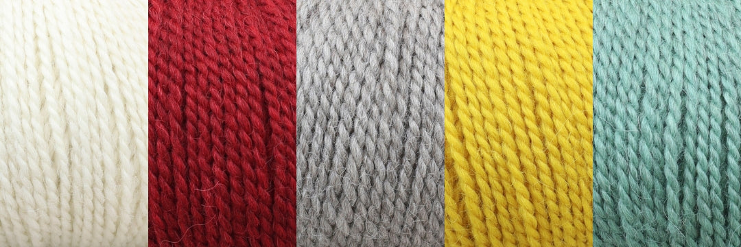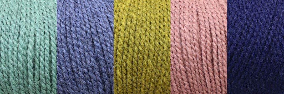 The Fibre Co. &Make Aran (50% Highland wool, 50% alpaca, 150 m (164 yd) per 100 g ball) in shades Cowabunga (A) – 2 (2, 2, 2, 2) (2, 2, 3, 3) balls, Prince (B) – 1 (1, 1, 1, 1) (2, 2, 2, 2) balls, Mon Ami (C) – 1 (1, 1, 1, 1) (2, 2, 2, 2) balls, Soft Love (D) – 1 (1, 1, 1, 1) (1, 1, 2, 2) balls, and Indigo Child (E) – 2 (2, 2, 2, 3) (3, 3, 3, 3) balls.
