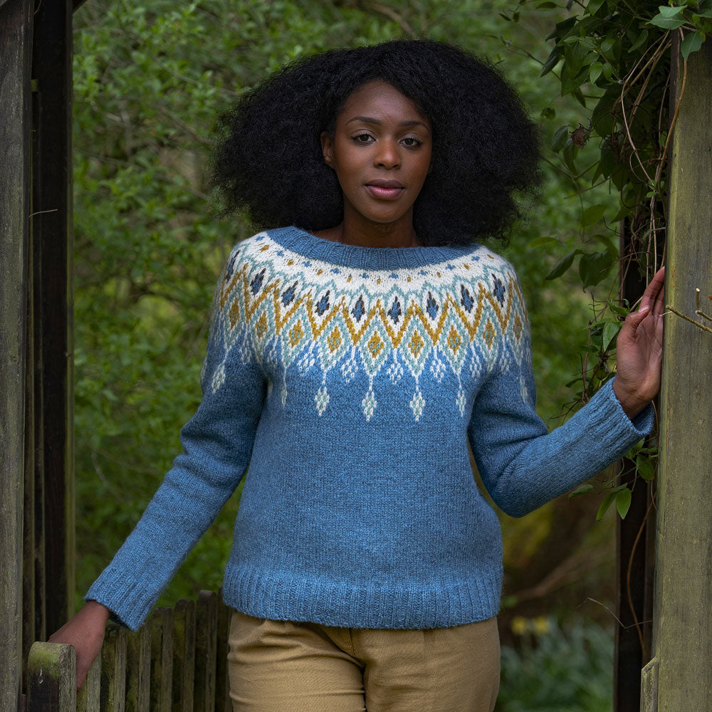 Seacross is a seamless sweater knitted from the top down with a stunning five-color yoke. The pattern includes two sets of instructions for the colorwork: one for knitters who are comfortable stranding several colors at once and one with swiss darning instructions for those who are less comfortable. Lore creates a light and lofty fabric that blooms beautifully when washed – perfect for colorwork!