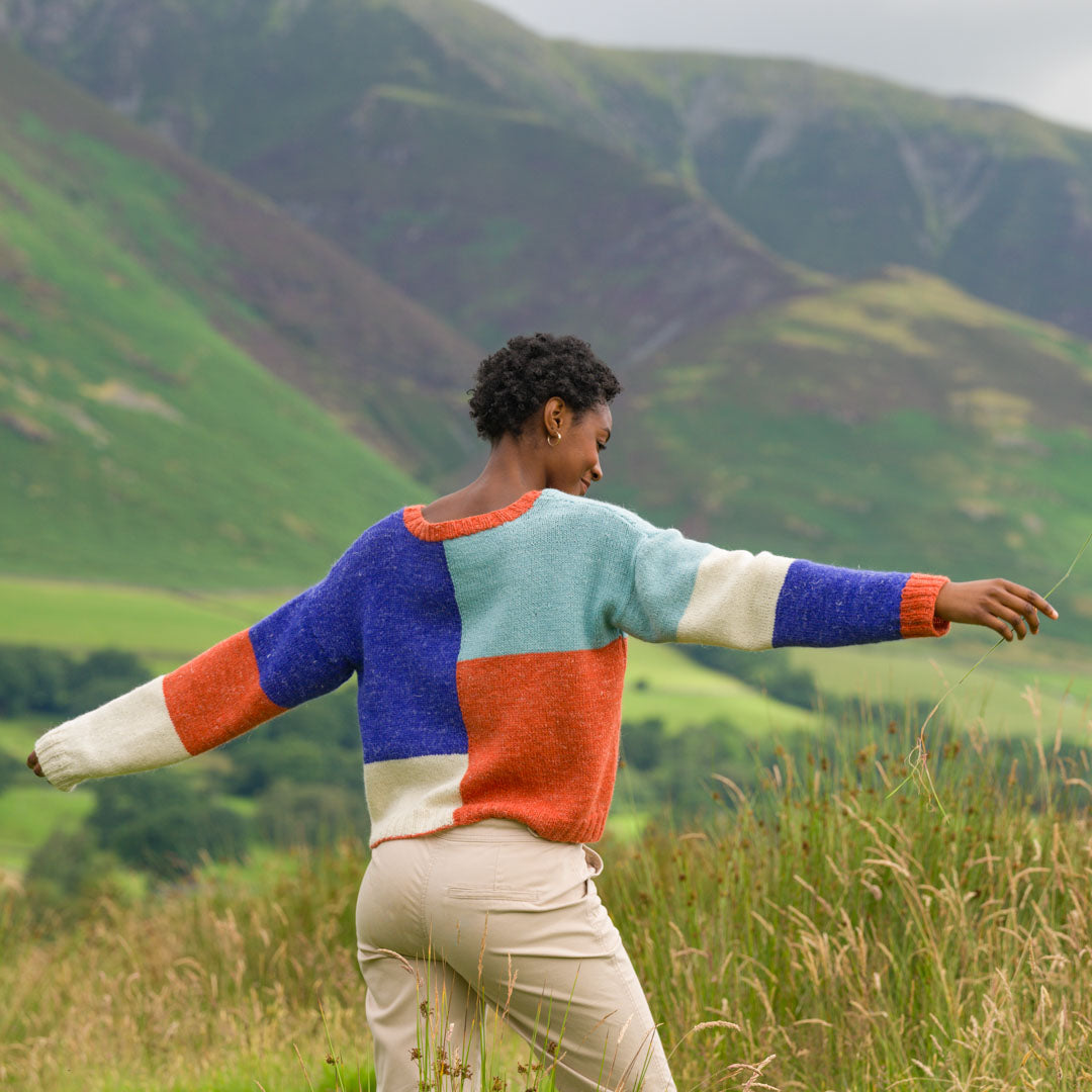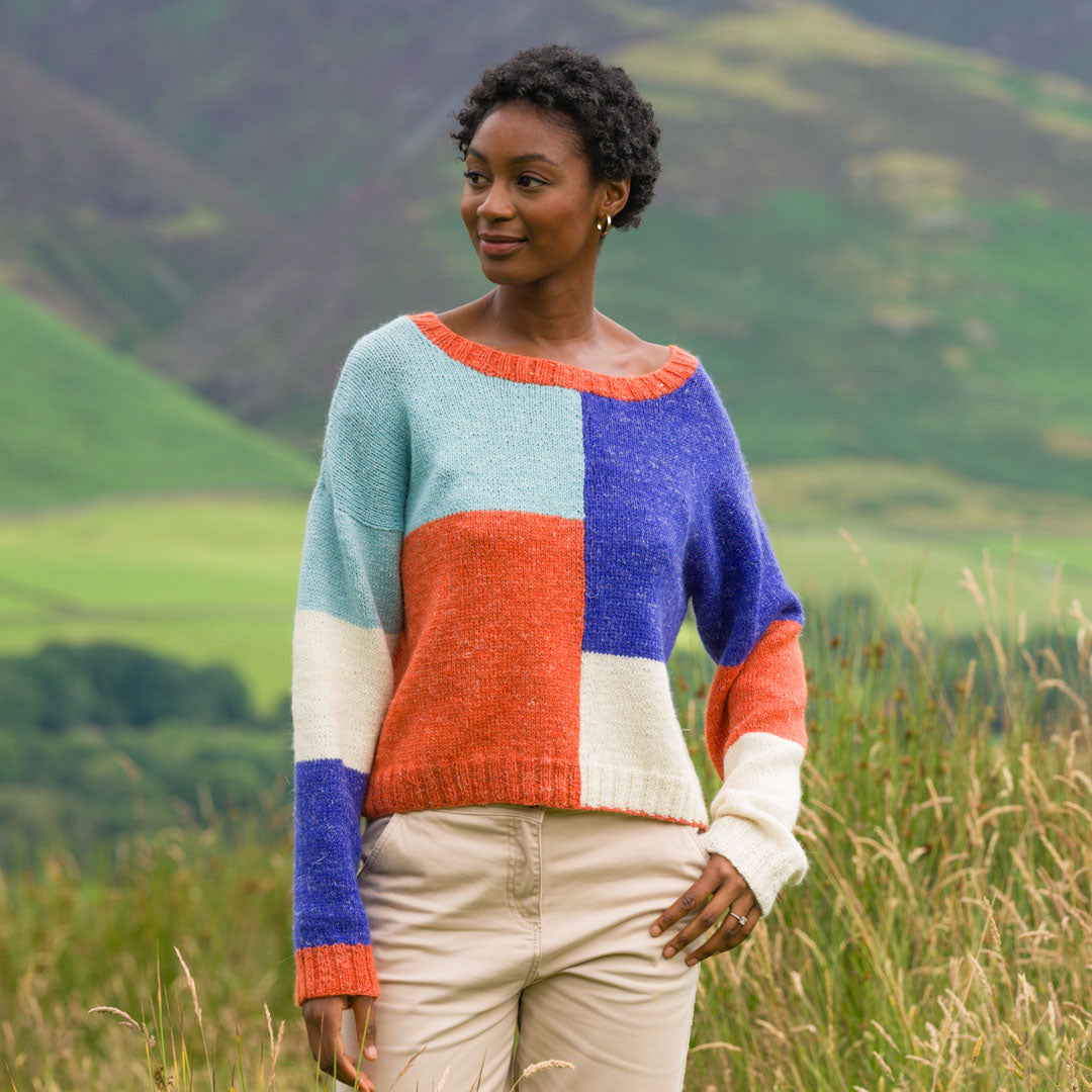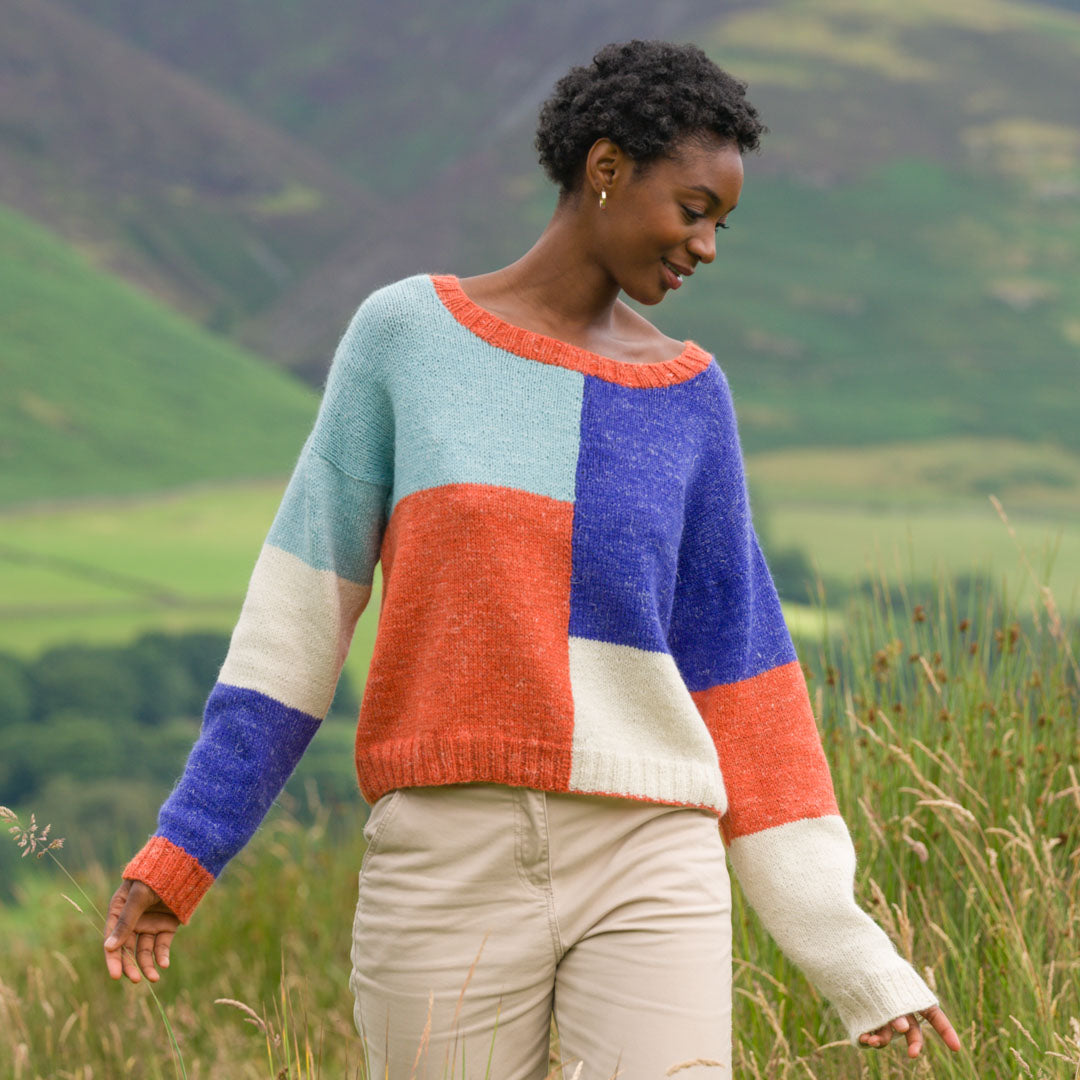 Knit in The Fibre Co.’s &Make DK, a blend of Peruvian Highland wool, alpaca, and linen, this pullover offers a perfect balance of warmth and breathability. The soft, lightweight fabric makes it an ideal layering piece for year-round wear, while the natural fibres provide a cosy drape that feels wonderful against the skin. Add some colour to your wardrobe with this playful and timeless design.