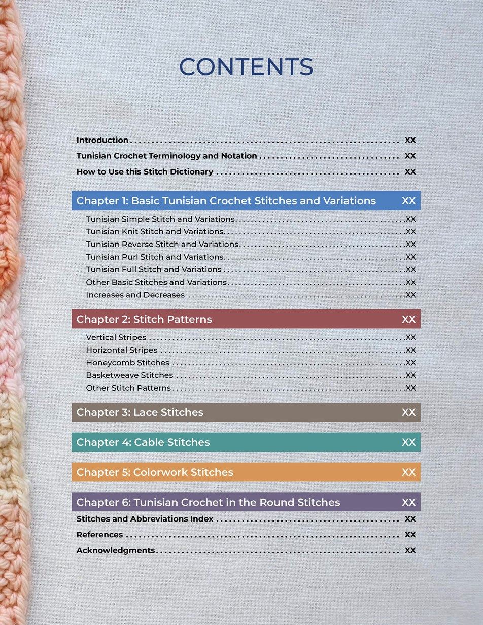 - 500+ Tunisian crochet stitches, each with swatch, crochet chart, row-by-row instructions and tutorial photos when needed