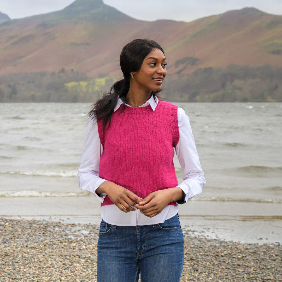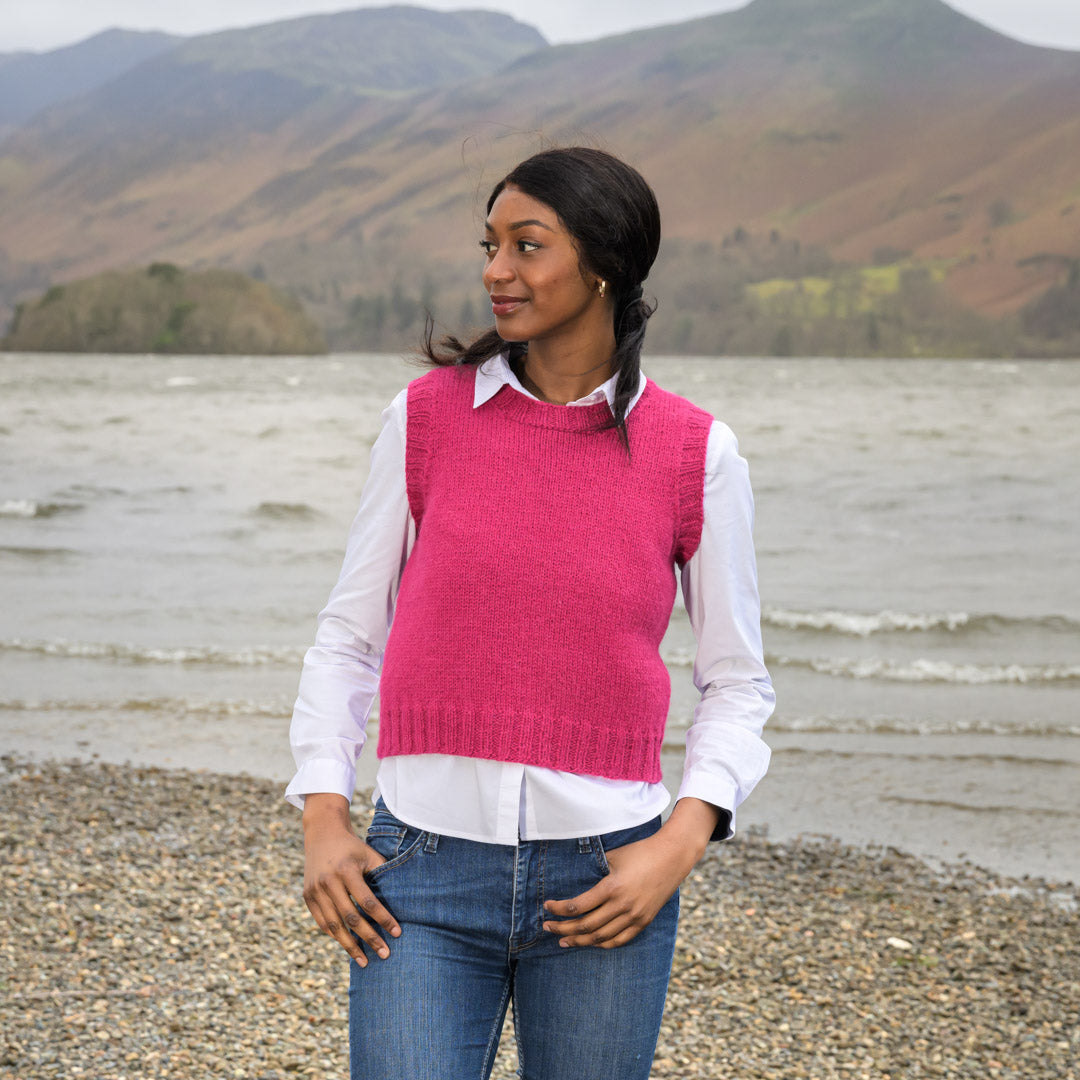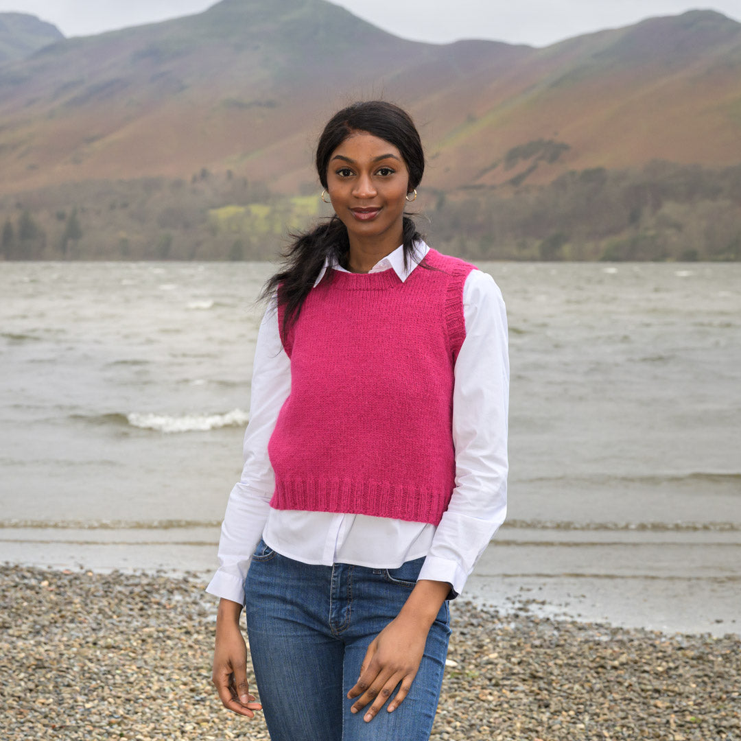 The Fibre Co. &Make Aran (50% Highland wool, 50% alpaca, 150 m (164 yd) per 100 g ball) in shade Mille Pink – 3 (4, 4, 4, 5) (5, 6, 6, 7) balls.