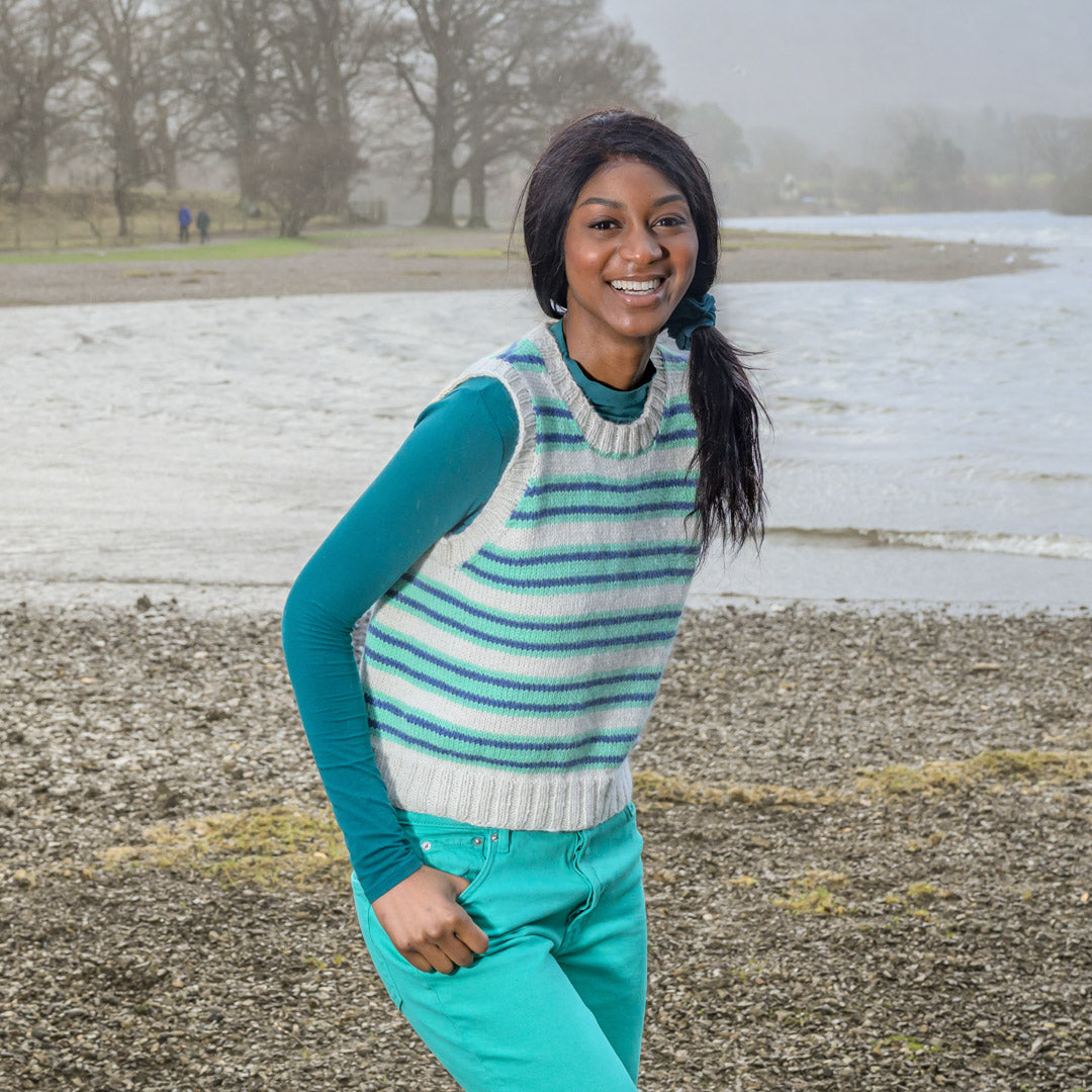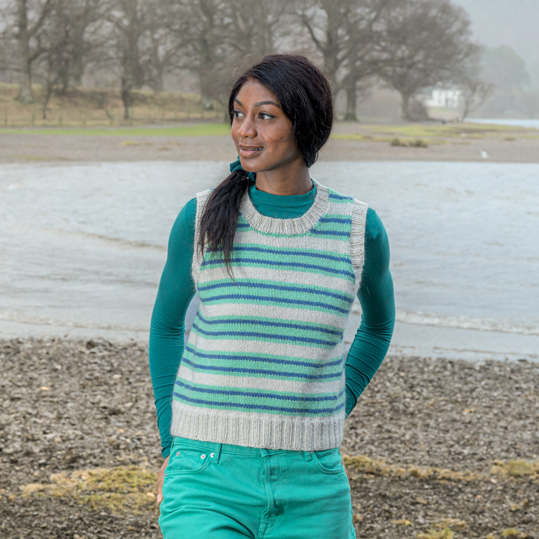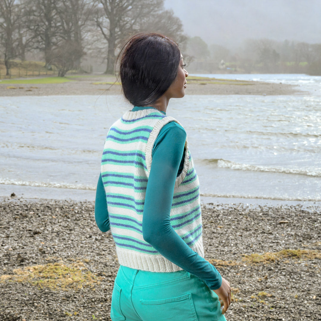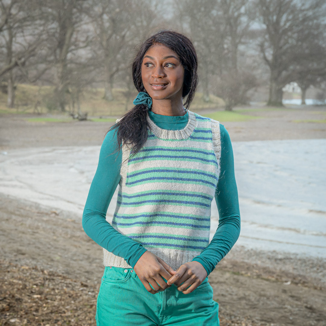 Available with three customization options including solid, striped, and colorblock, you can make this vest uniquely yours. Created with &Make Aran, the FlexVest will be strong and warm yet soft, thanks to the lovely blend of Peruvian Highland wool and alpaca. It’s worked in the round from the hem up to the armholes, then the front and back are split and knit flat. Your knitting experience will be more exciting and challenging with the more colors you add. Enjoy creating your own beautiful, handmade vest!