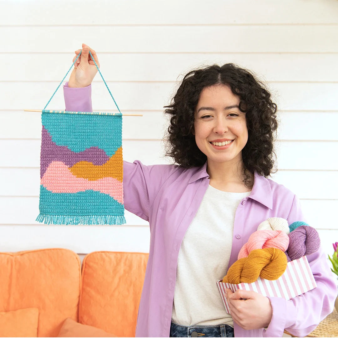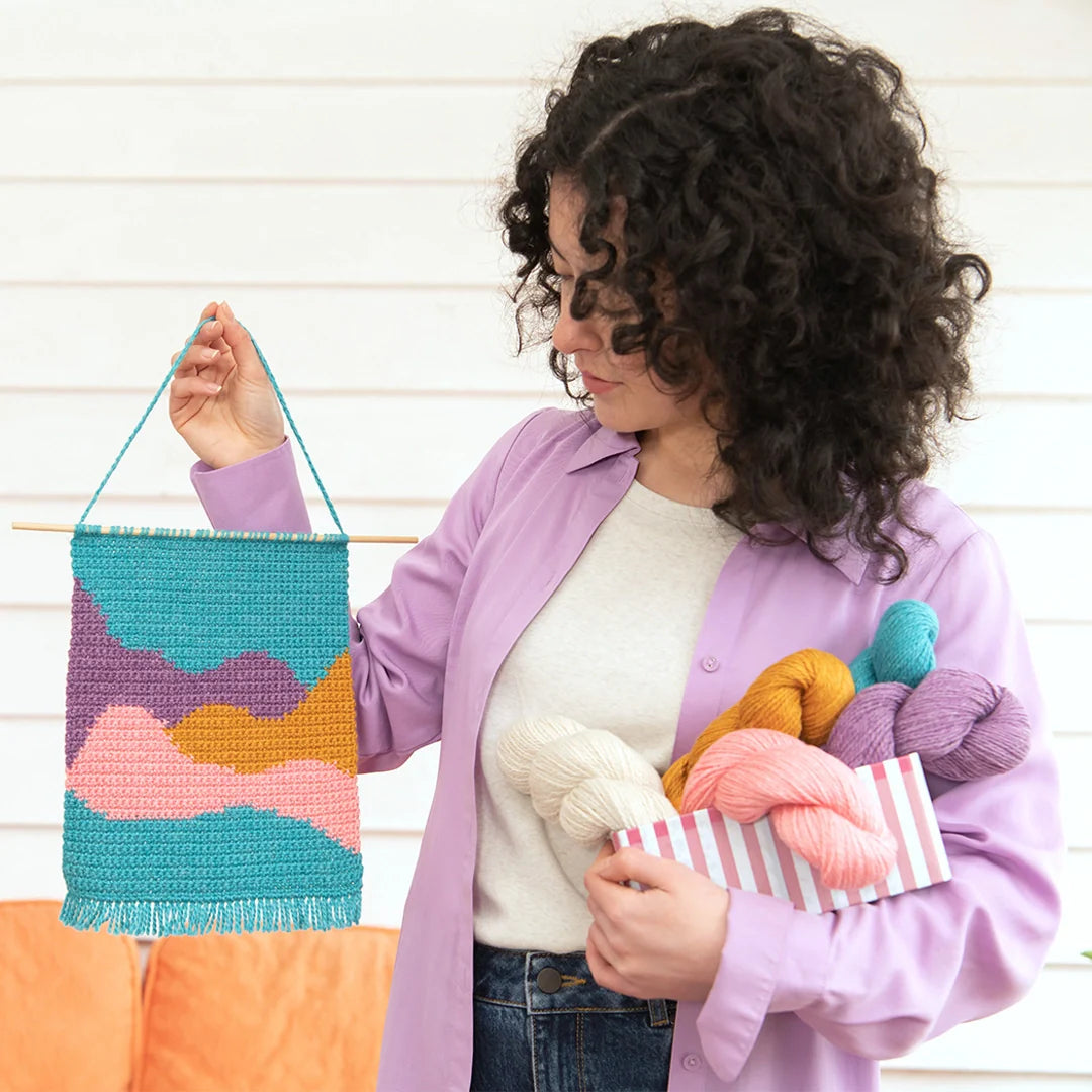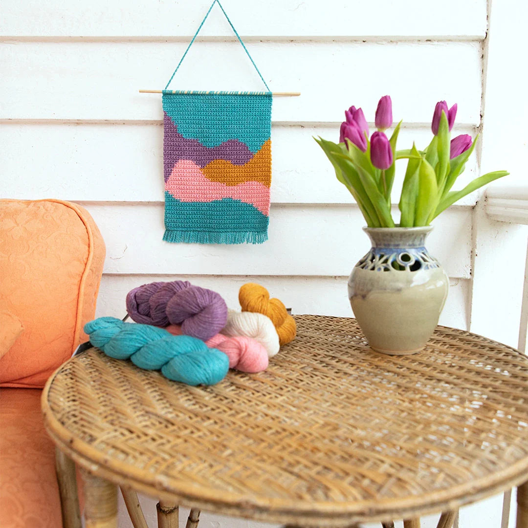 Way Over Yonder Tapestry is a bold colorwork wall hanging that evokes the summertime call of the open road. Inspired by the bright colors in the Luma range and how they can capture a moment of stillness in a landscape, designer Amber Millard describes her technique as ‘painting with yarn’. The charming landscape design is worked entirely in simple double crochet stitches in four bold shades, and is completed with a fringe. Crocheters will follow a clear color chart to create this pleasing fibre art piece.