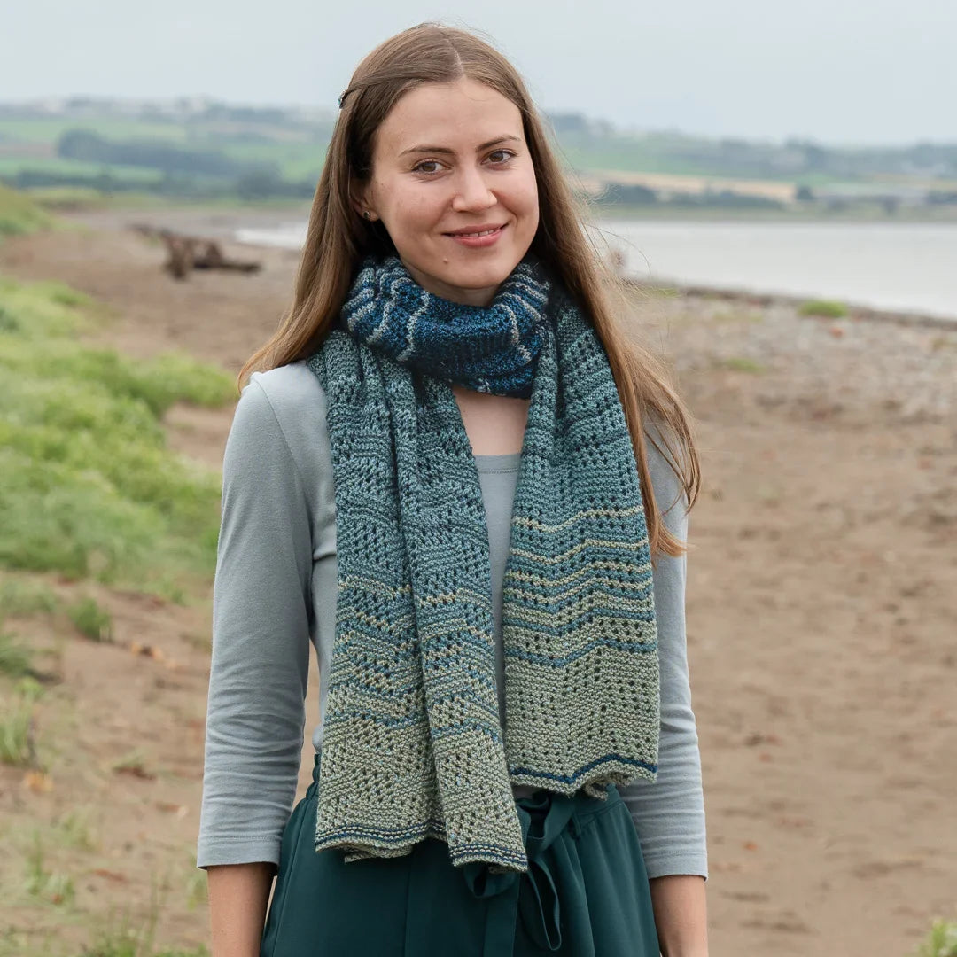 Designed in The Fibre Co.’s Acadia—a rich blend of Merino, baby alpaca, and silk noil—this wrap promises a delicate drape and sumptuous texture, feeling heavenly against the skin. Made with five shades of Acadia, the Ways of Water Wrap serves as a delightful project for confident beginners and seasoned knitters, bringing vibrant oceanic inspiration to every wardrobe.
