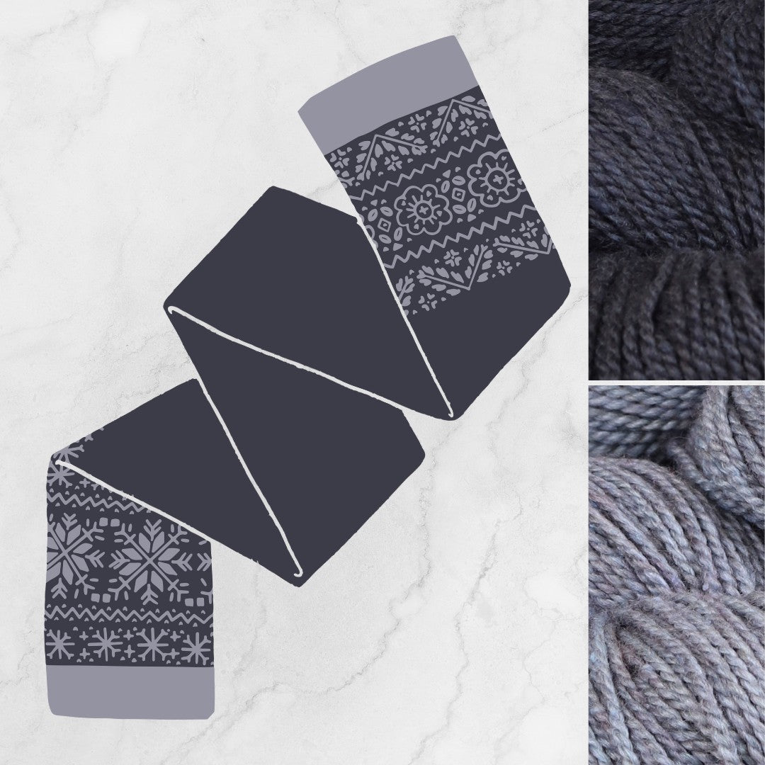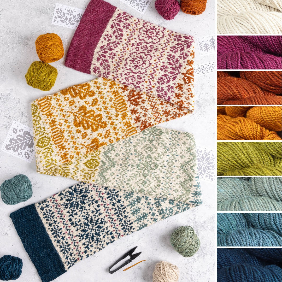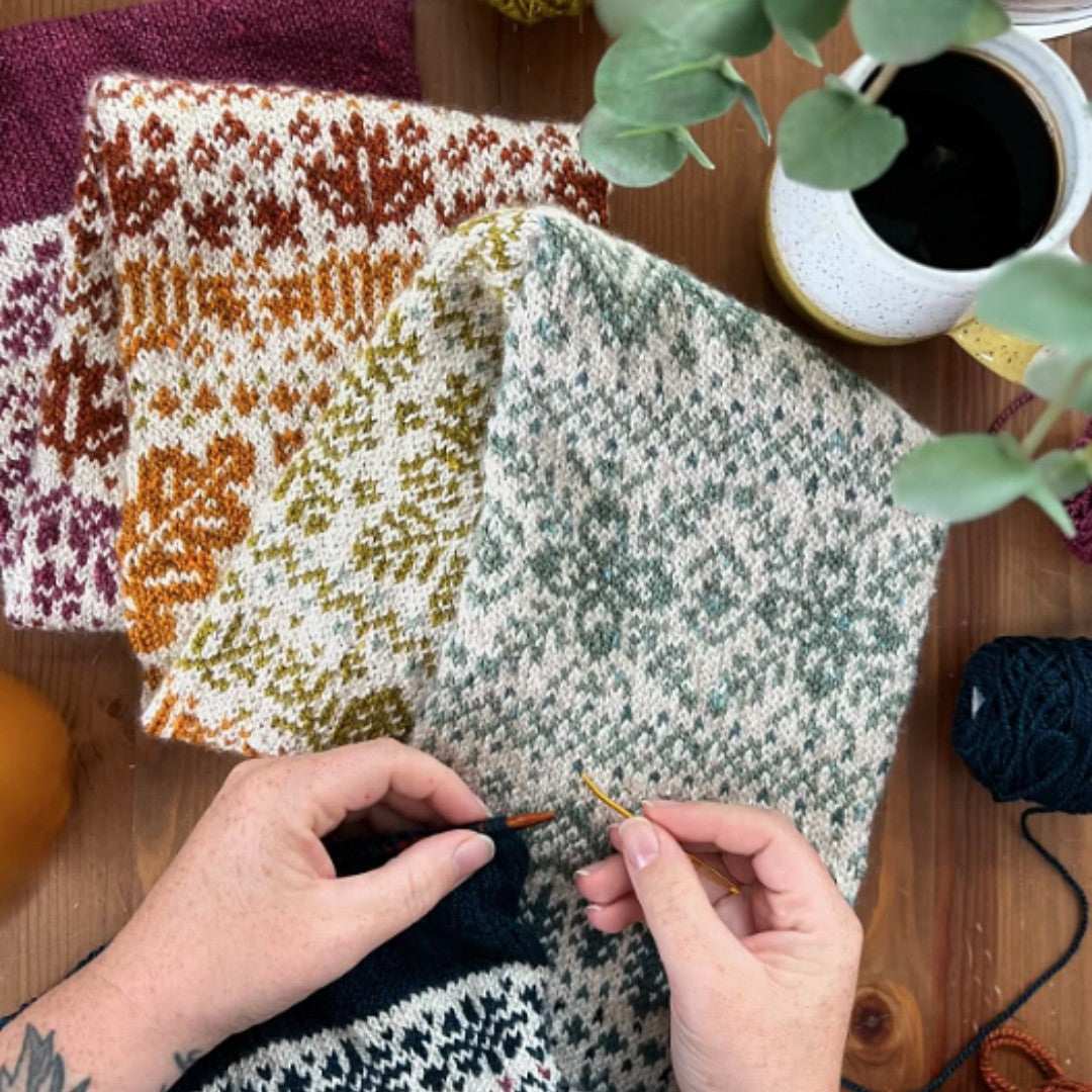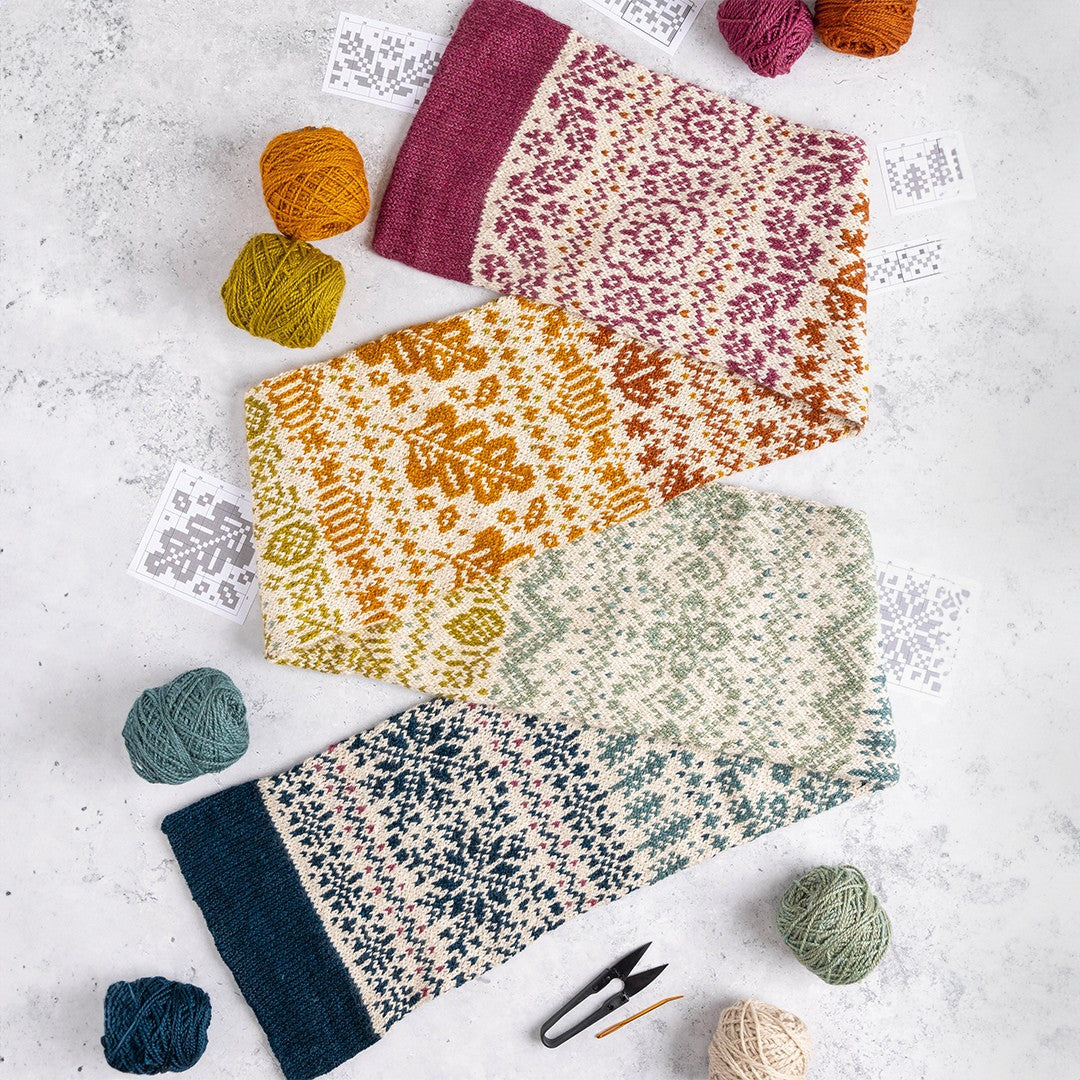 The pattern is worked in the round as a tube on circular needles, from end to end. Beginning with Judy’s Magic Cast On, you can work your custom design for the stranded colorwork until it reaches your desired length. The live stitches are then grafted closed, providing a seamless finish that matches the cast on.