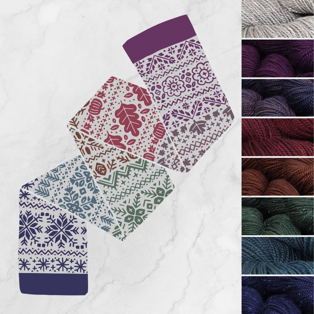 The Fibre Co. Acadia (60% Merino wool, 20% baby alpaca, 20% silk, 125 m (137 yd) per 50 g hank) in shades Egret (MC) – 4 hanks, Rosebay – 1 hank, Orange Storm – 1 hank, Sugar Maple – 1 hank, Yellow Birch – 1 hank, Summersweet – 1 hank, Blue Heron – 1 hank and Thunder Bay – 1 hank.