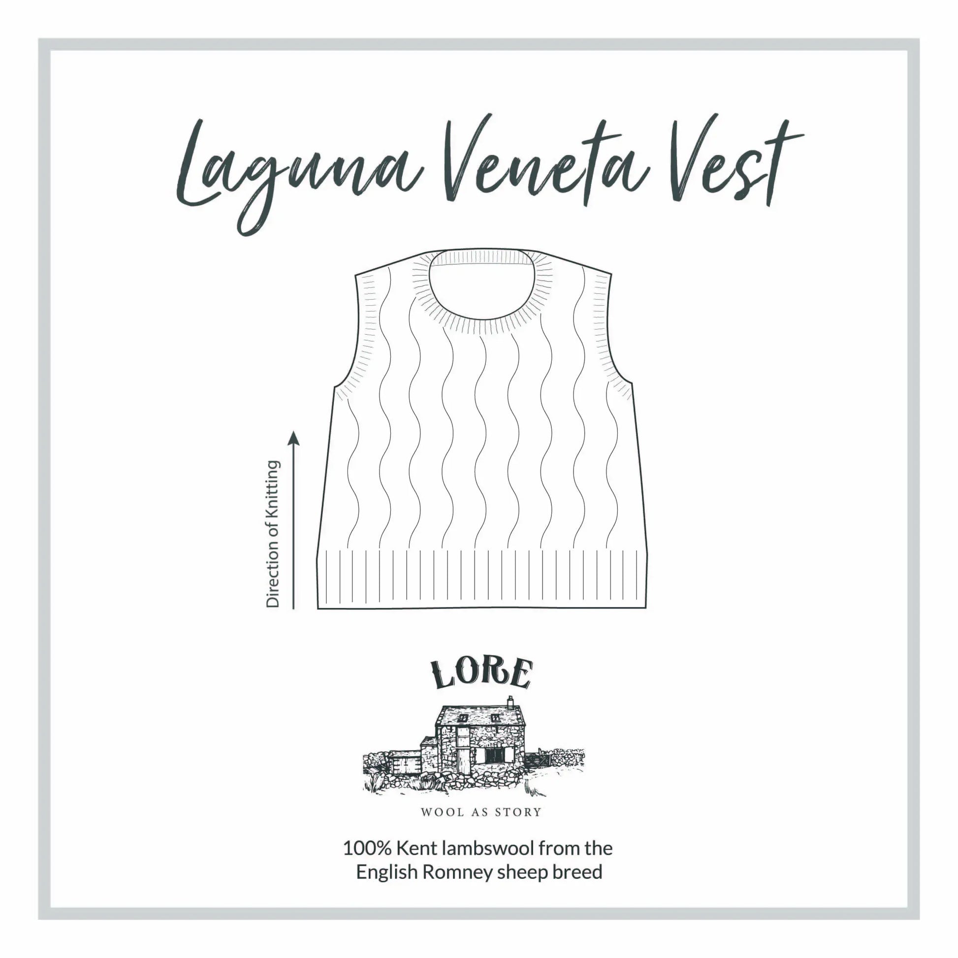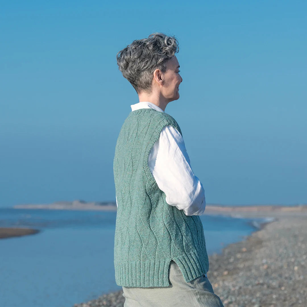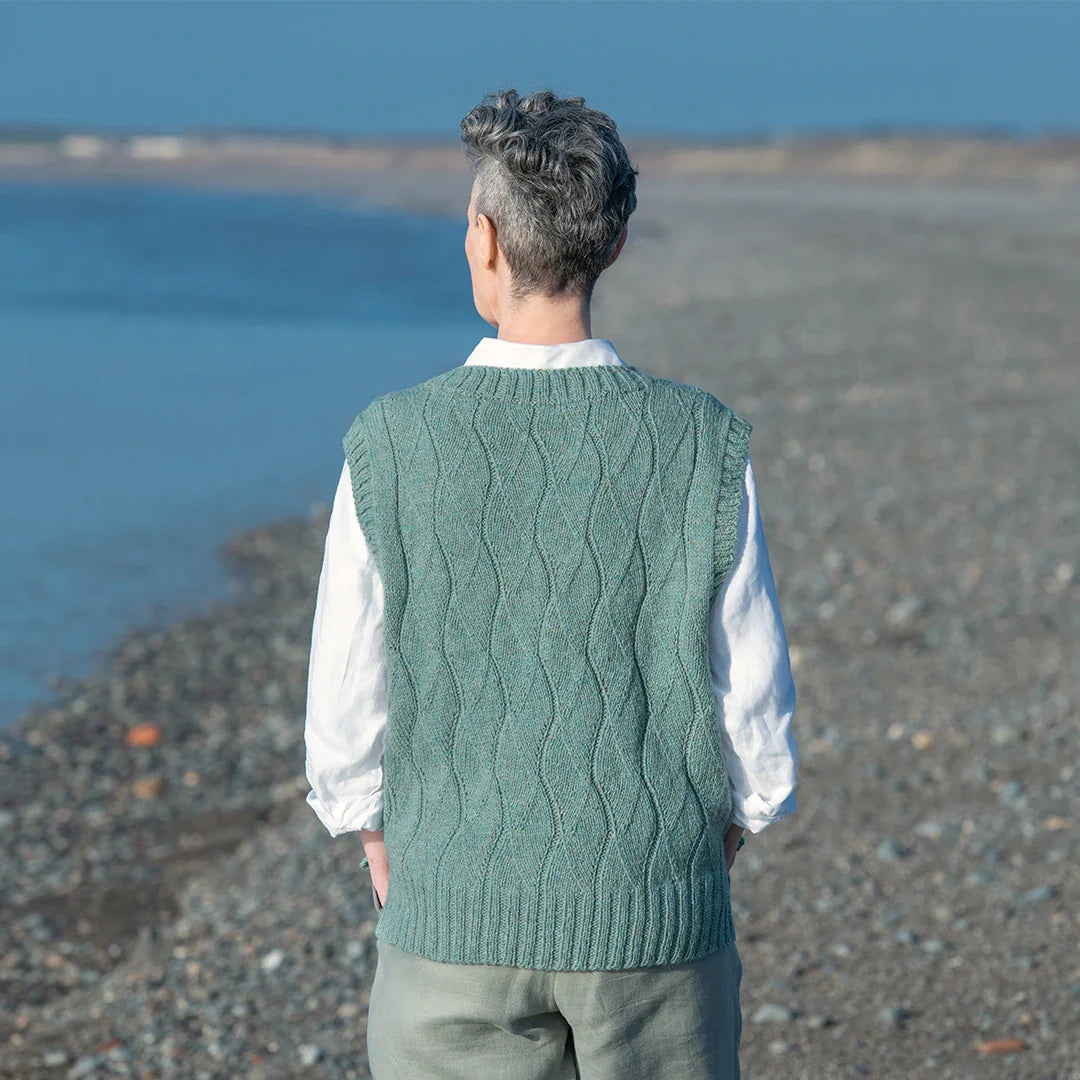 This contemporary vest features an all-over wave pattern that grows out of the hem ribbing and up into the wide crew neck. An easy-to-wear yet stylish layering piece to keep you warm when going about your daily activities, Laguna Veneta Vest is not too difficult to knit for an advanced beginner but not too easy for more advanced knitters.