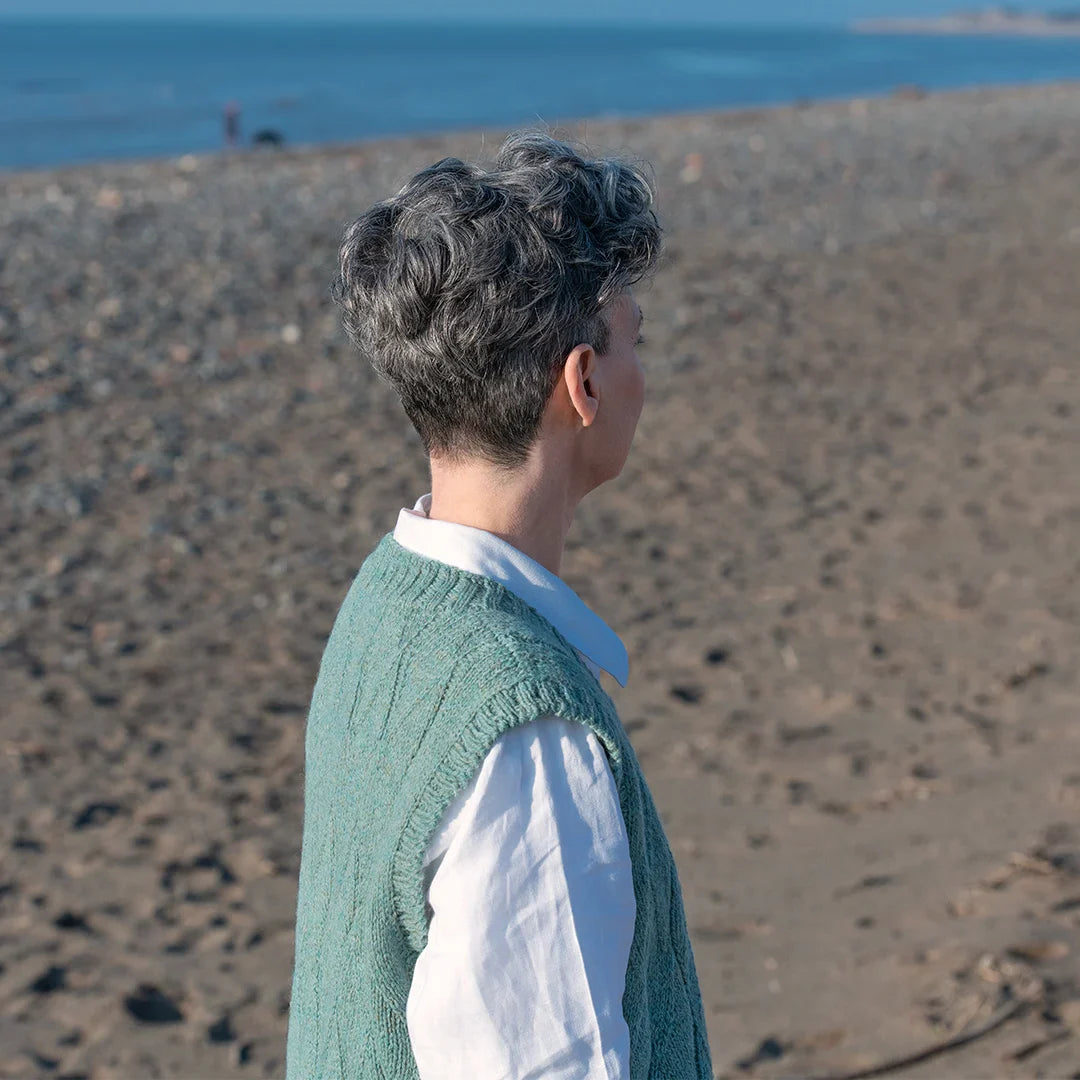 This vest is knitted bottom up seamlessly, flat to create the rib hem slits, and then in the round to the underarm, where the work is then divided to work the front and back sections flat. Short row shaping is incorporated at the shoulders for an improved fit. The sleeves are picked up in the round for knitting a few rounds of ribbing. The ribbed neckline is picked up last.