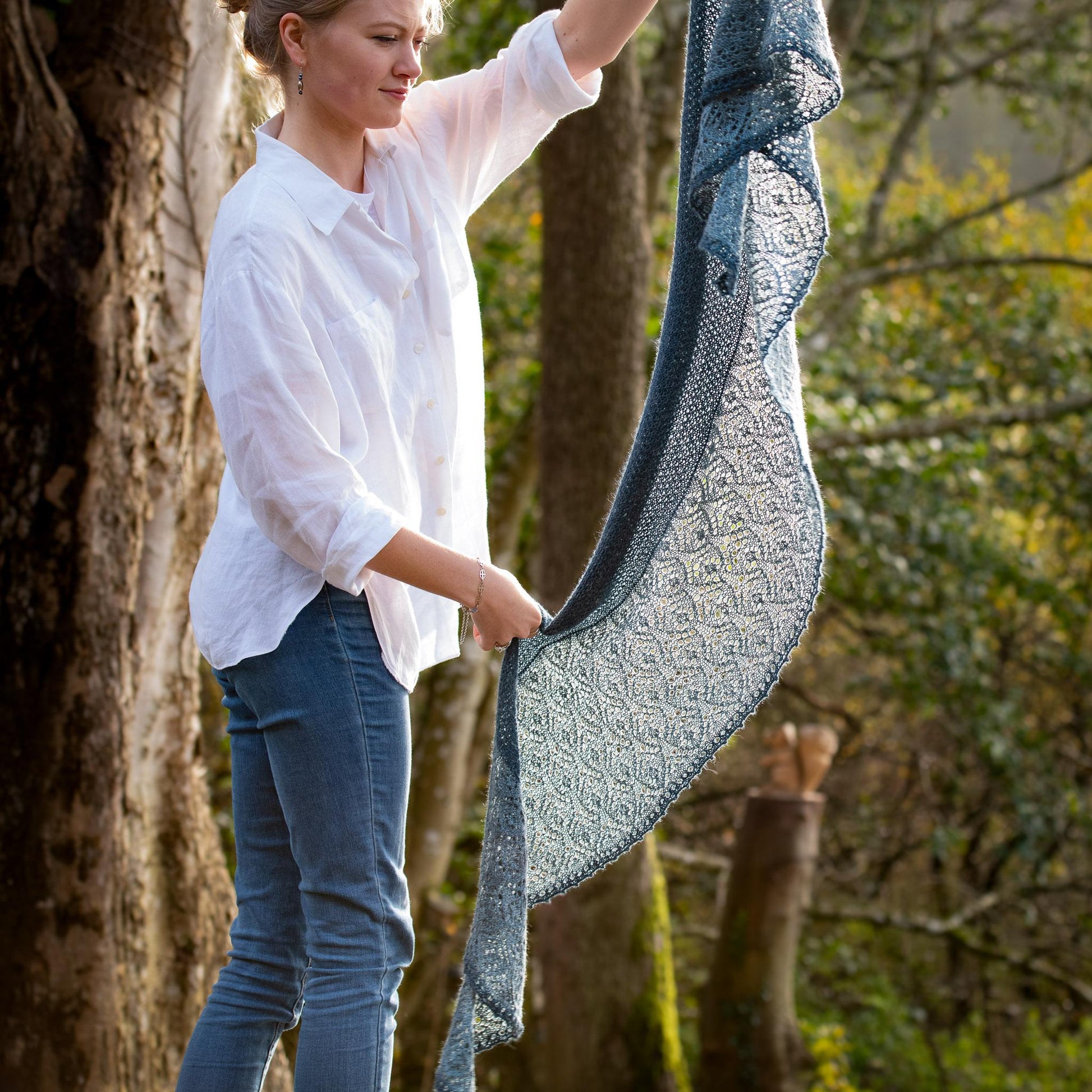Lobelia is a textured crescent-shaped shawl by Joanna Ignatius, featuring a floral-inspired lace border, lateral braid detail, picot bobbles and lots of slipped stitches. More details