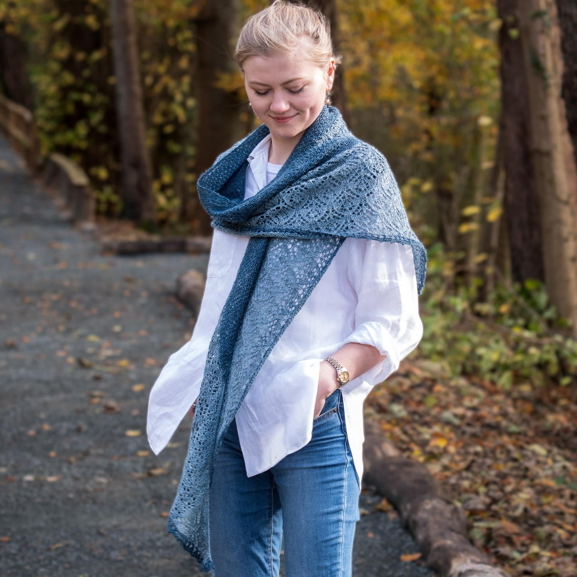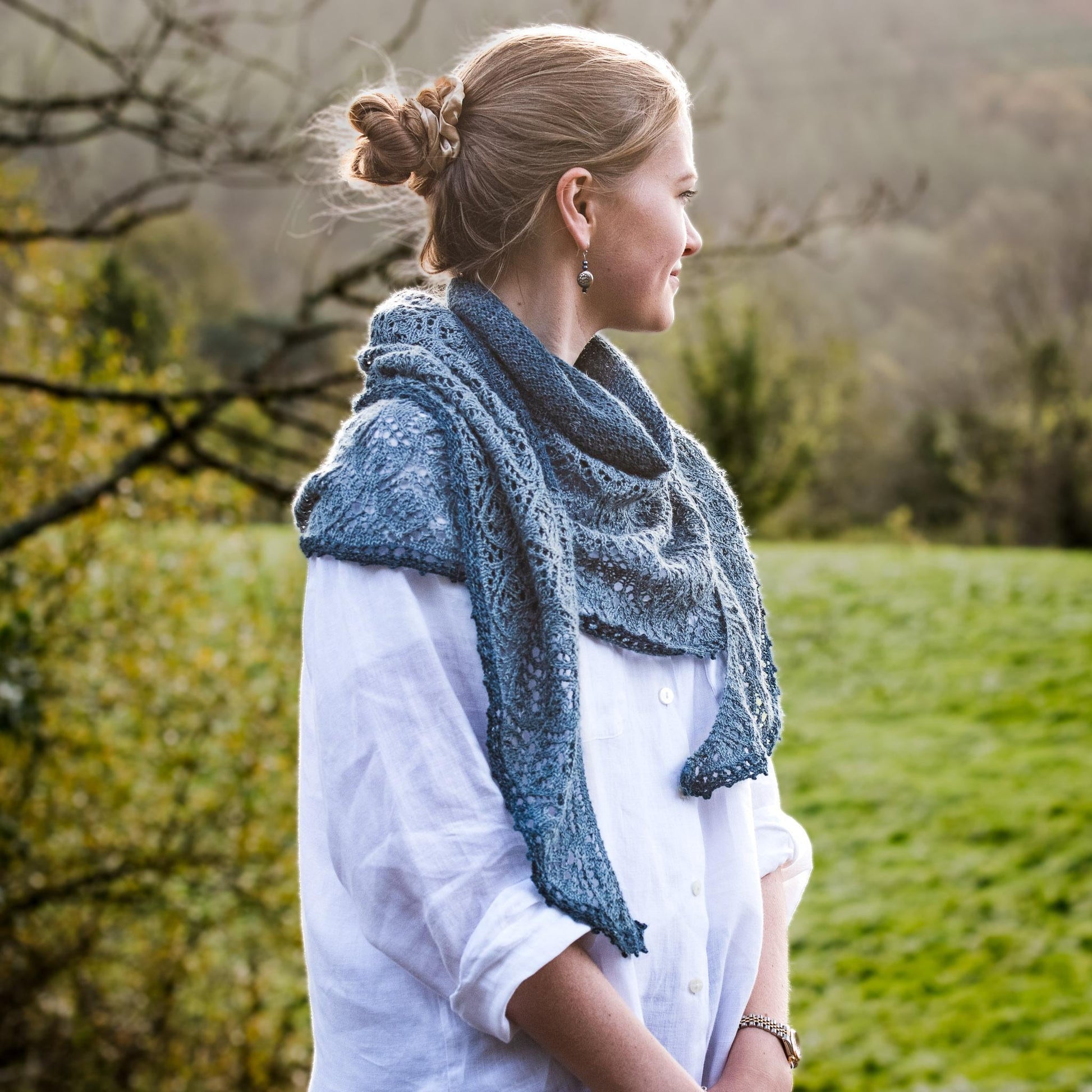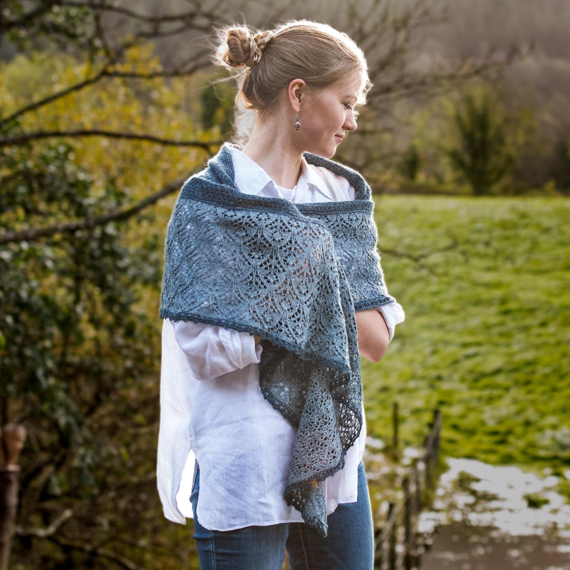 Lobelia is a textured crescent-shaped shawl by Joanna Ignatius, featuring a floral-inspired lace border, lateral braid detail, picot bobbles and lots of slipped stitches. Designed for 2 shades of Meadow and inspired by her homeland in Finland, nature, and the changing of seasons.