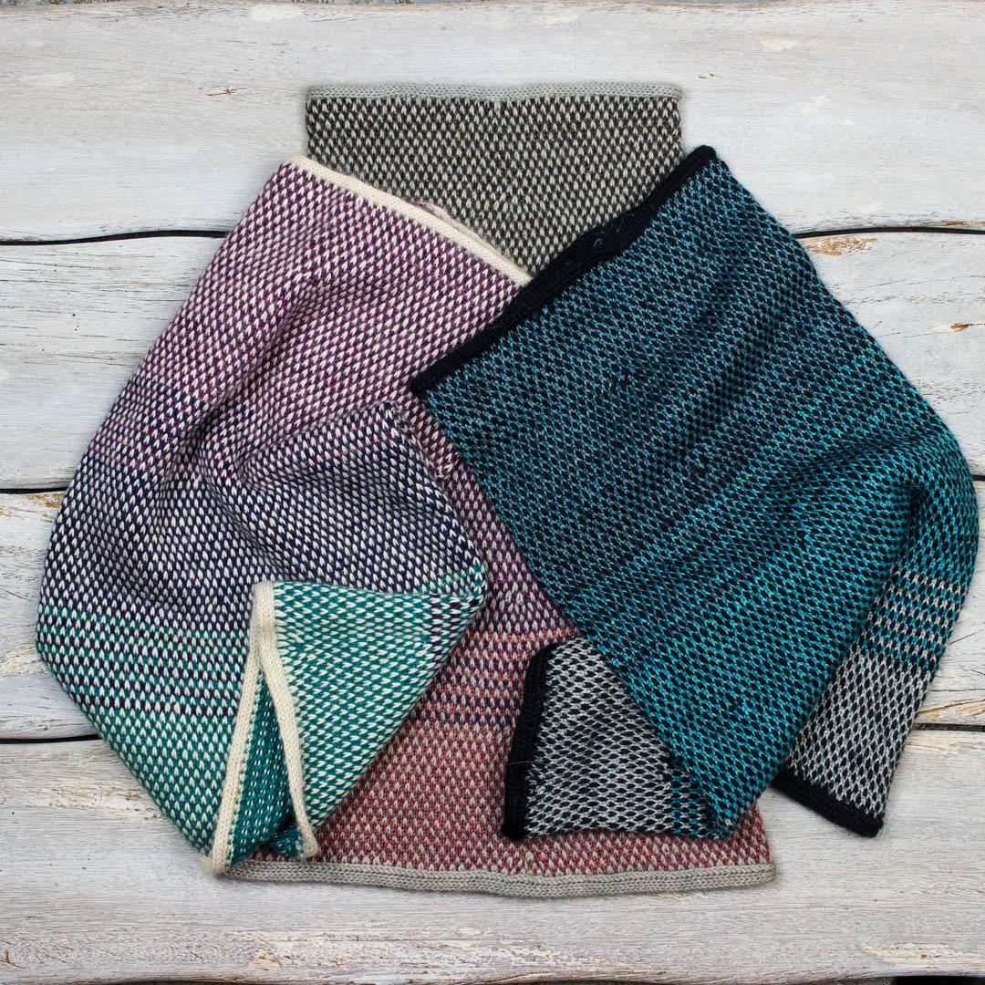 The photos show the cowl in the shades Mother of Pearl (MC), Tanzanite (CC1) Cobalt (CC2) and Apatite (CC3).