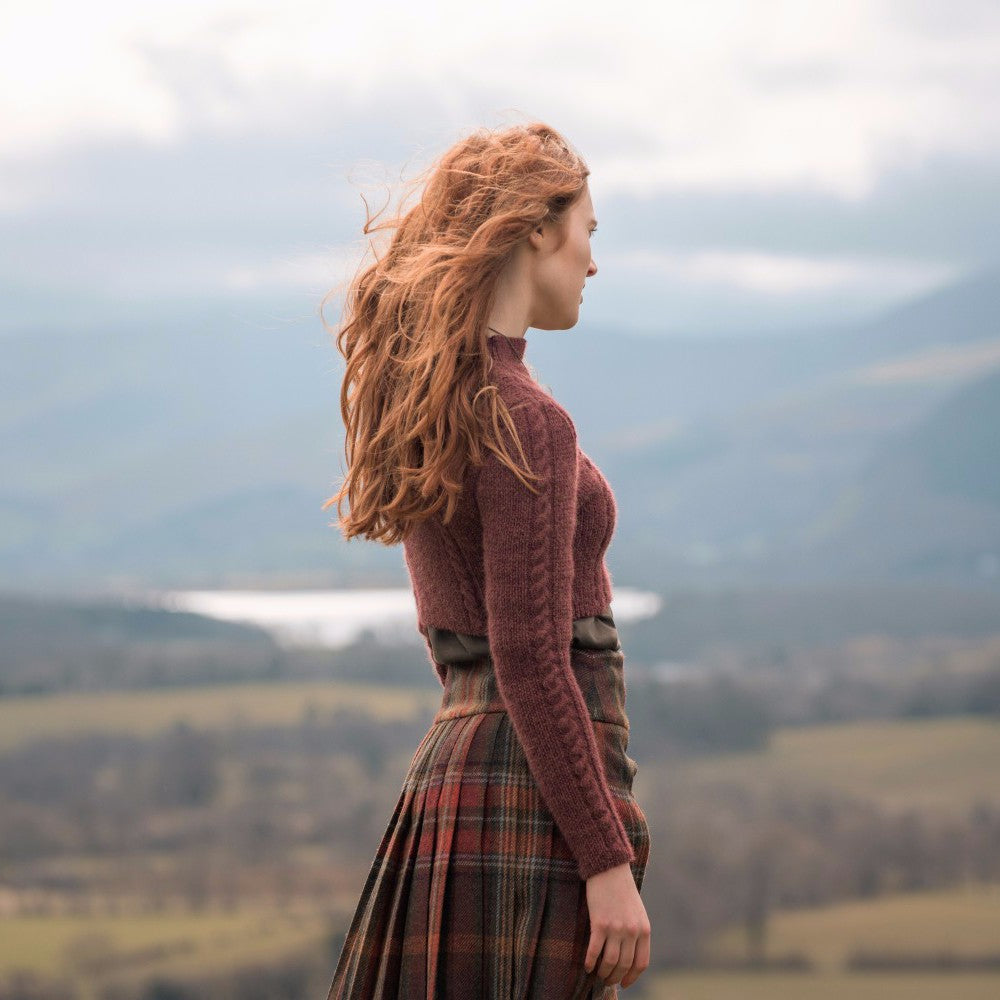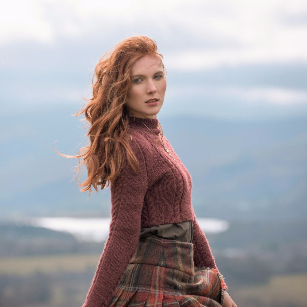 This cropped, fitted sweater features cable details on the back, front and sleeves. The garment is worked in pieces from the bottom up and seamed.