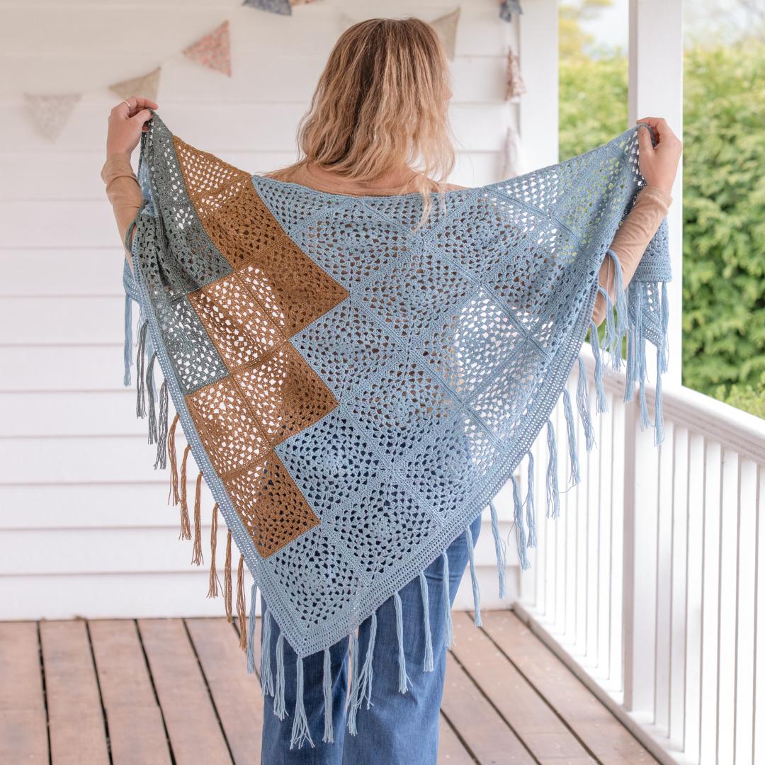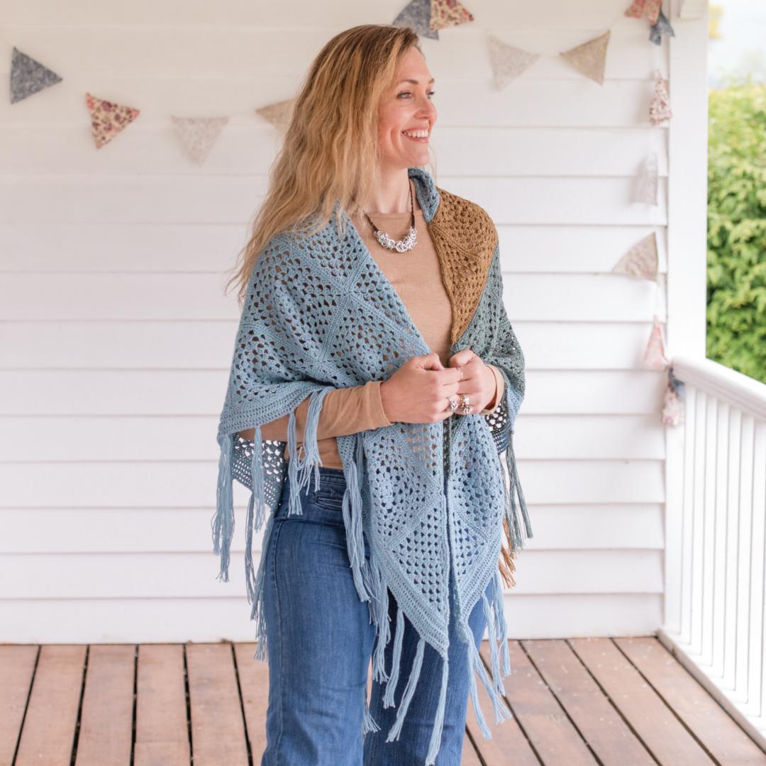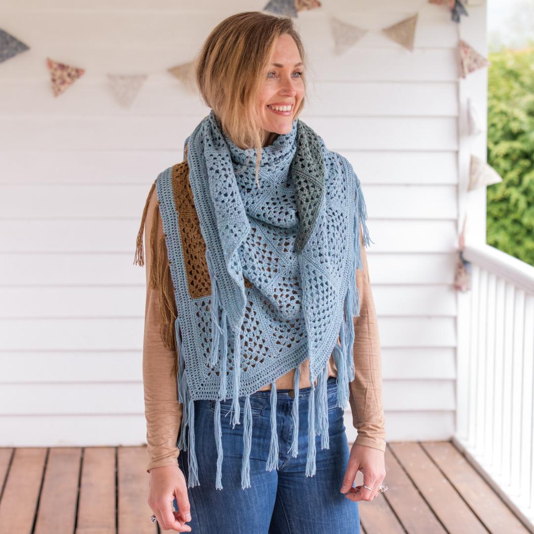 The Perpetual Dawn Shawl by Rosina Northcott of Zeens and Roger is triangular summer accessory made up of simple floral blocks in three harmonious shades. The squares are assembled to give a subtle geometric color pop, and a long fringe is added to elevate the design.