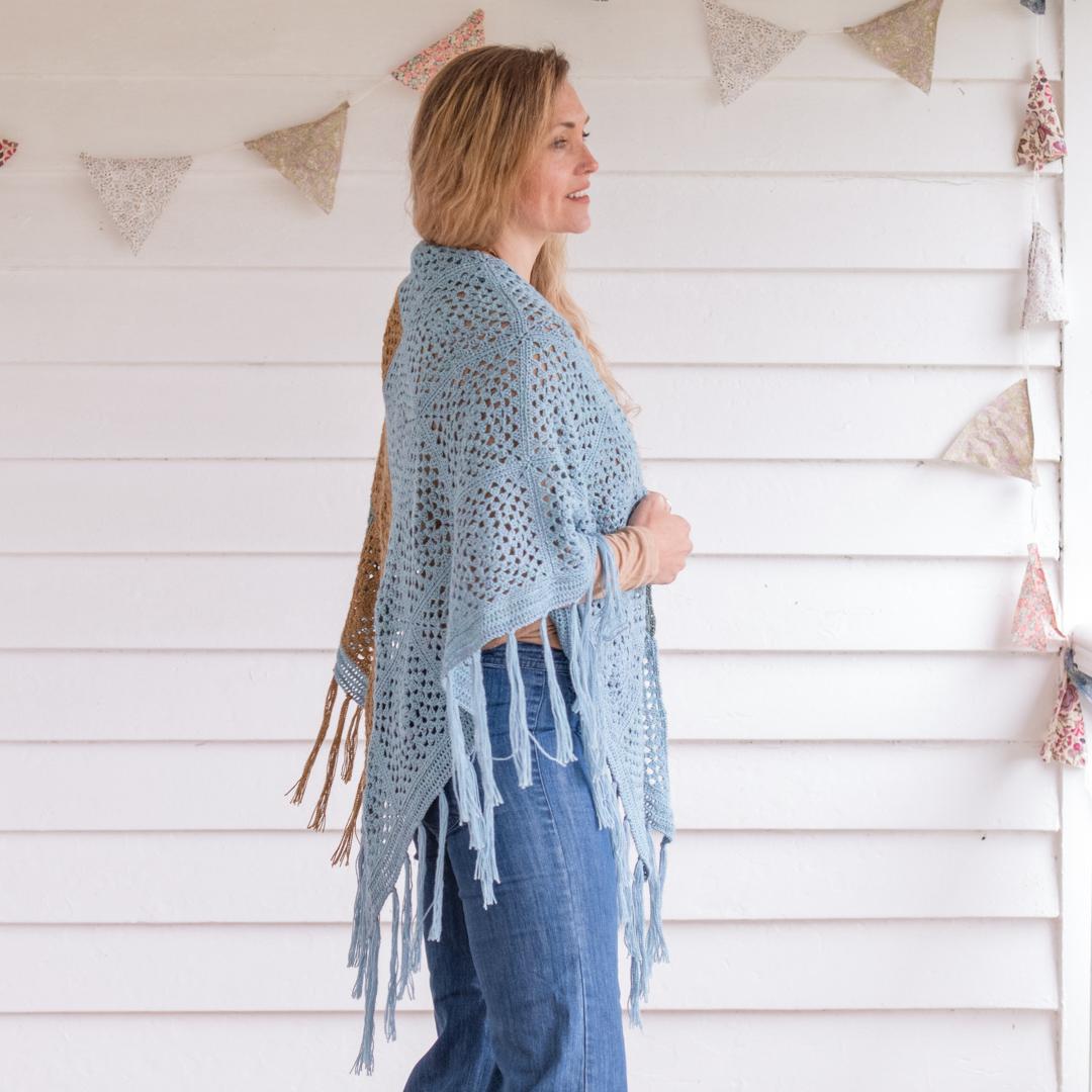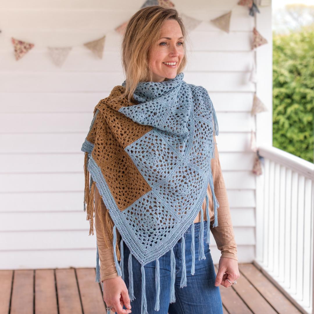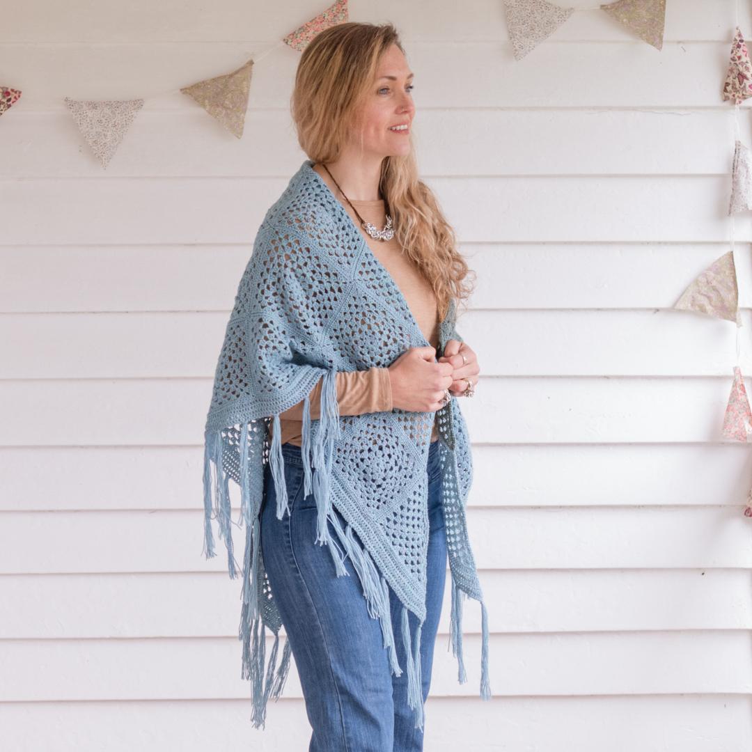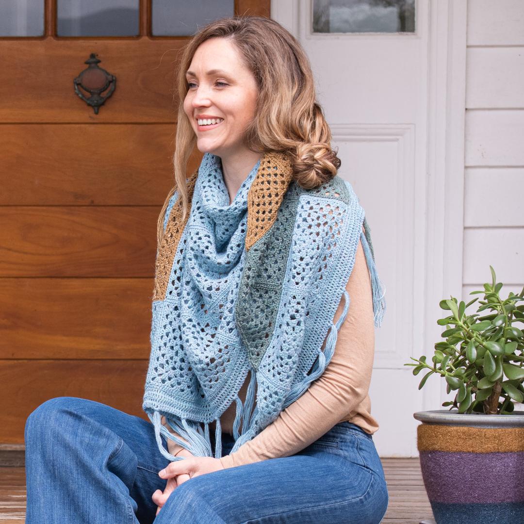 The Perpetual Dawn Shawl by Rosina Northcott of Zeens and Roger is triangular summer accessory made up of simple floral blocks in three harmonious shades. The squares are assembled to give a subtle geometric color pop, and a long fringe is added to elevate the design.