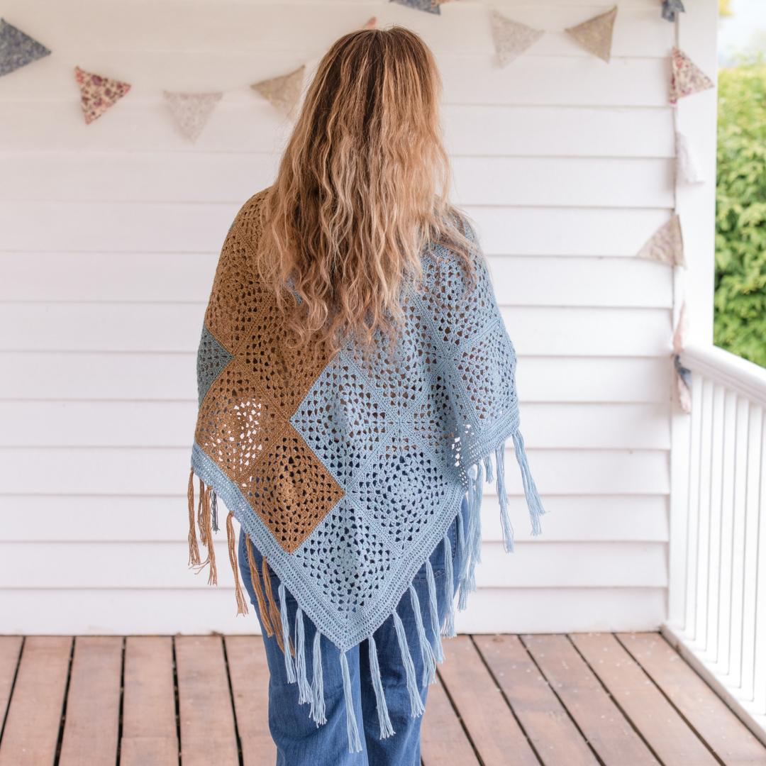 The shawl is made from individual squares and triangles that are made separately and joined together using single crochet stitches. The squares are worked without turning after each round and the triangles are turned after each row. Once joined, a border is crocheted in rows and tassels are attached at regular intervals.