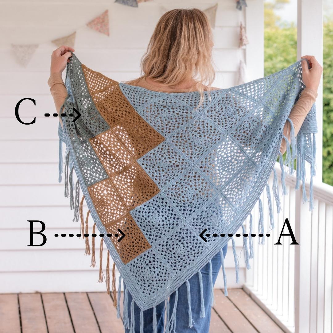 The photos show the shawl in the shades Hydrangea (A), Prairie (B) and Fennel (C).