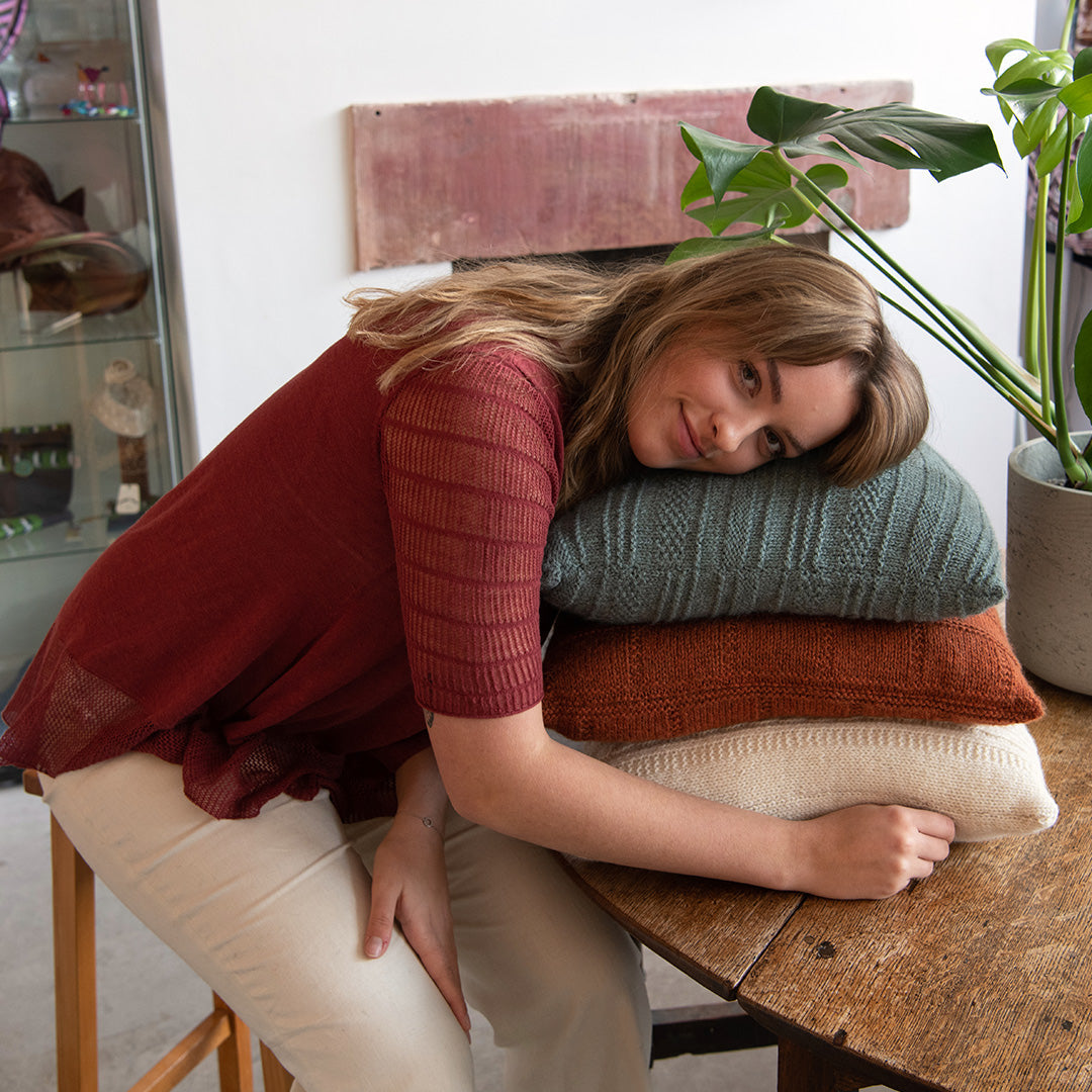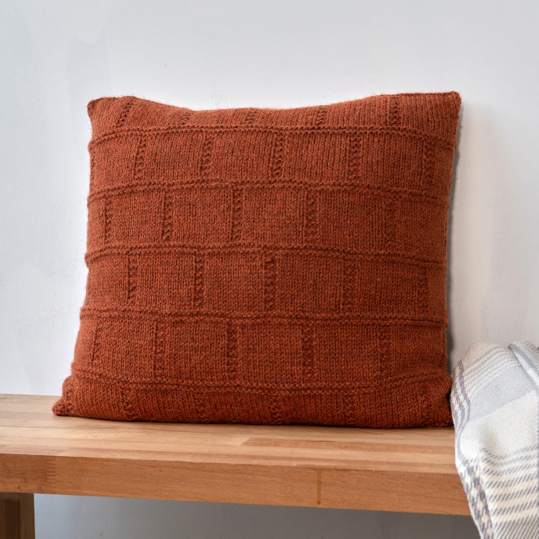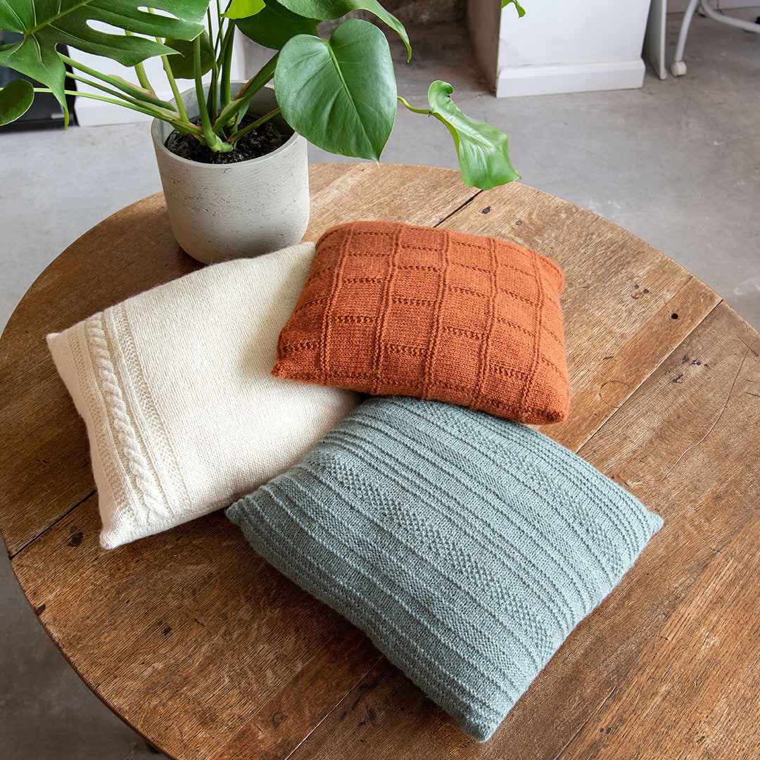 Nothing says comfort like a pile of cozy cushions, and we are delighted to offer you three possibilities with lots of interesting textures; a brickwork stitch pattern, a texture stripe pattern and a classic cable and garter stitch pattern. There are twenty eye-catching shades to match your home color scheme in a luxurious blend of Highland wool and alpaca. Try a new technique such as cables or adding texture to your knits, and add a touch of comfort to your home with &Make.