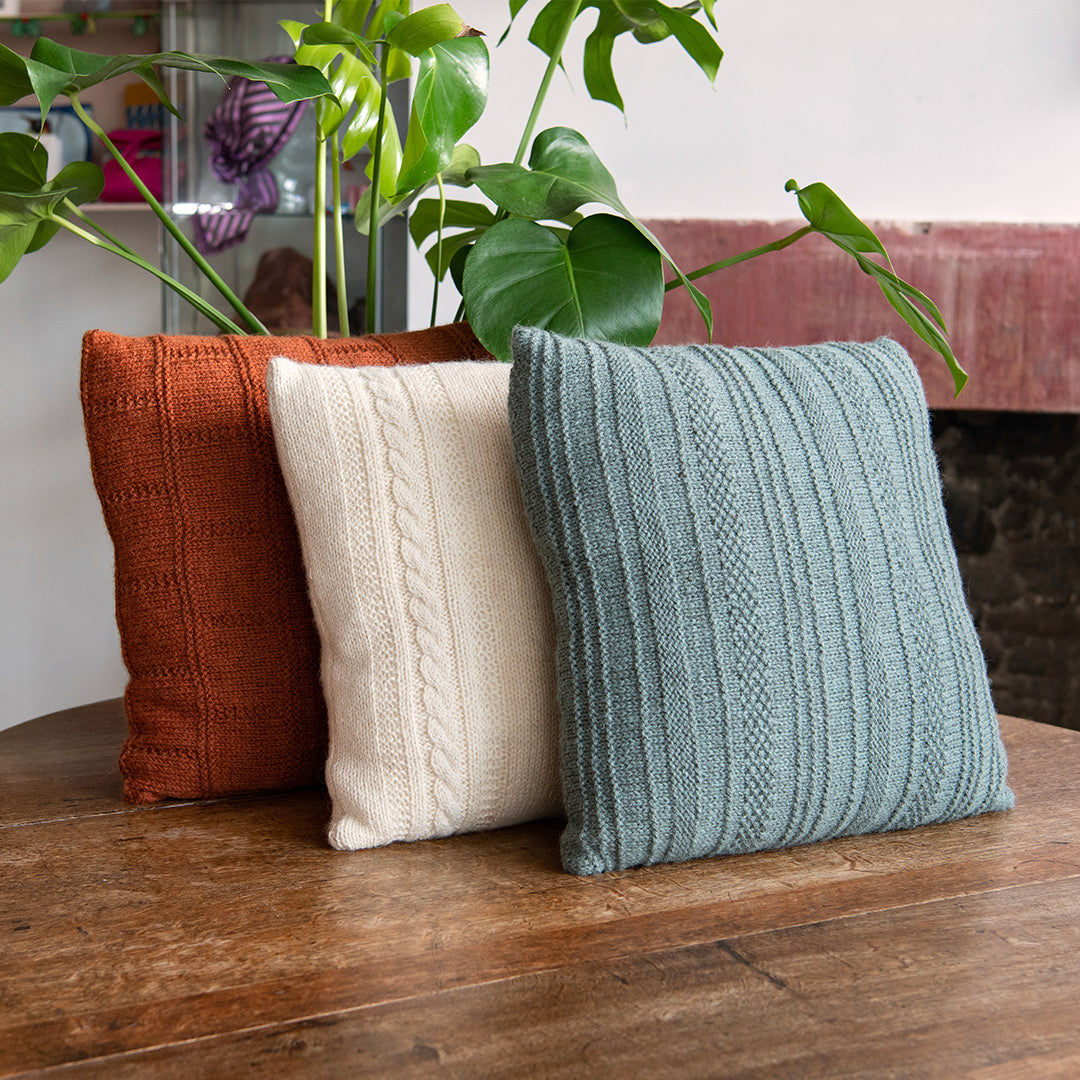 Nothing says comfort like a pile of cozy cushions, and we are delighted to offer you three possibilities with lots of interesting textures; a brickwork stitch pattern, a texture stripe pattern and a classic cable and garter stitch pattern. More details