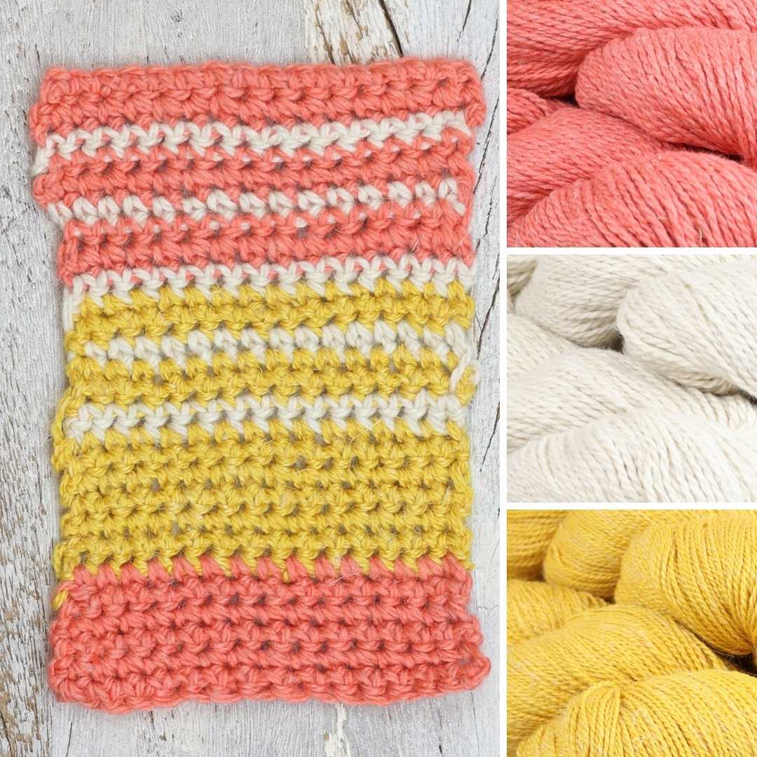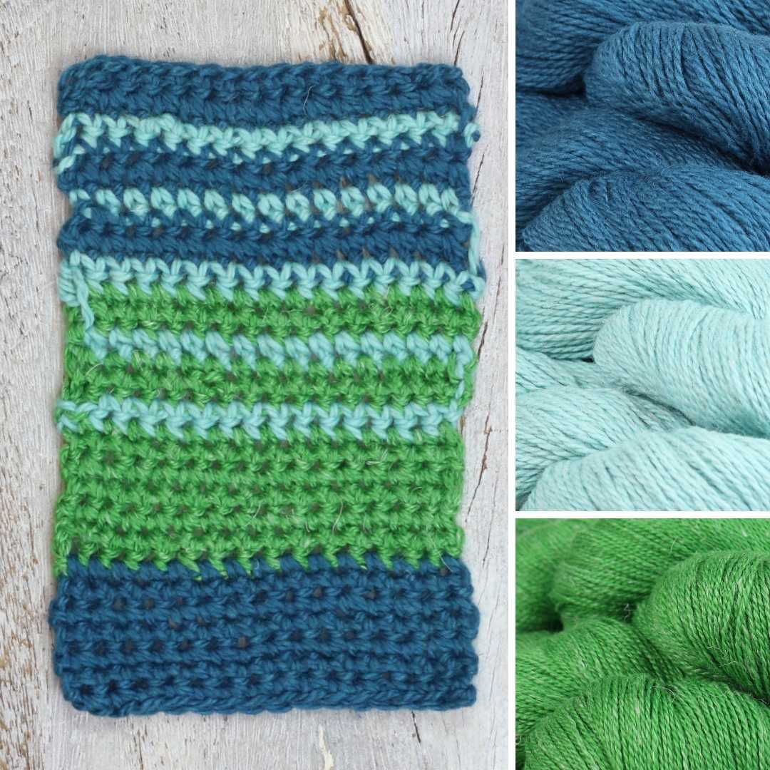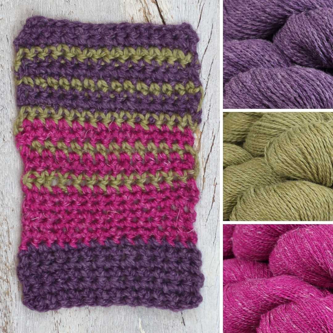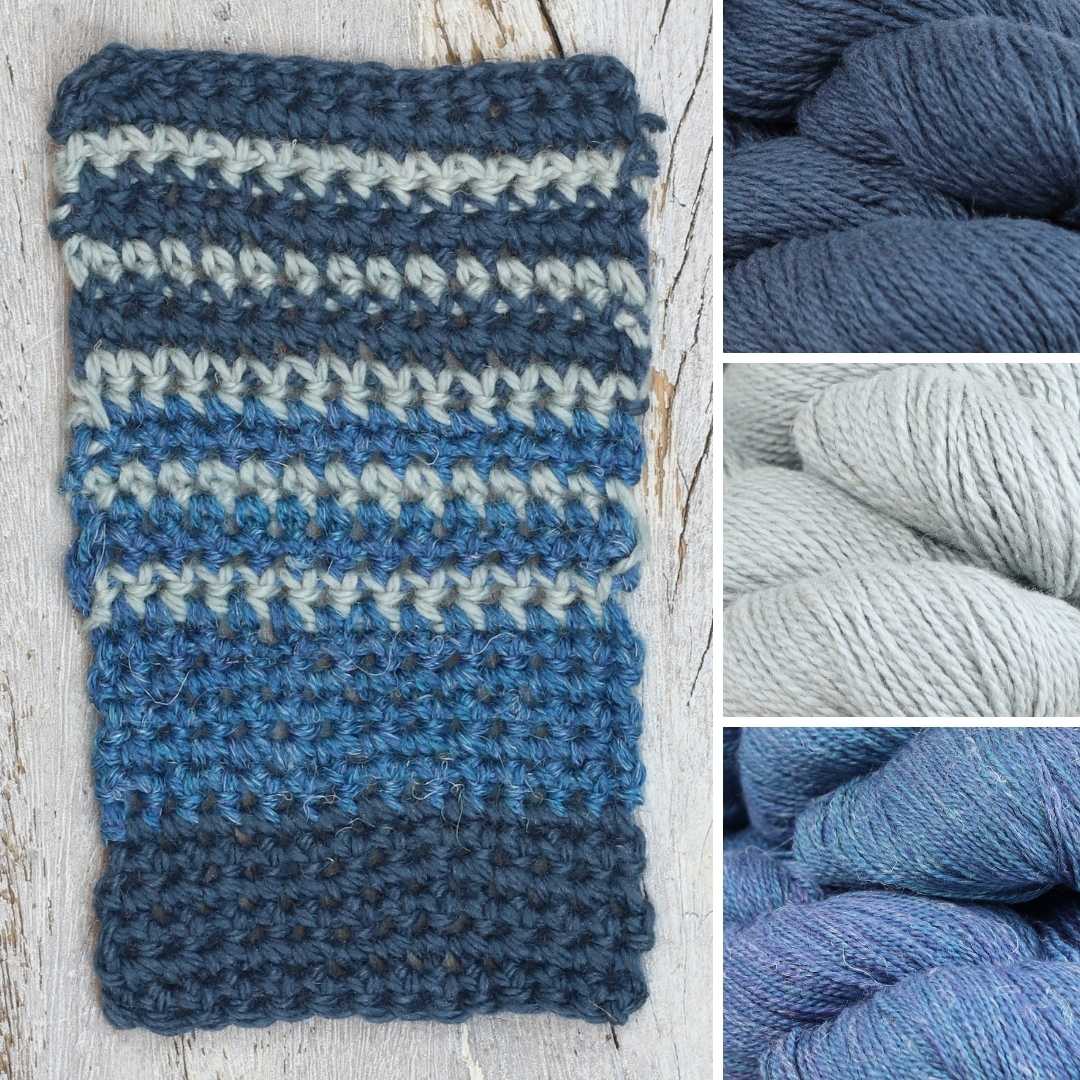 The Fibre Co. Luma (50% Merino wool, 25% organic cotton, 15% linen, 10% silk, 125 m (137 yd) per 50 g hank) – 11 hanks; The Fibre Co. Meadow (40% Merino wool, 25% baby llama, 20% silk, 15% linen, 498 m (545 yd) per 100 g hank) – 2 hanks.