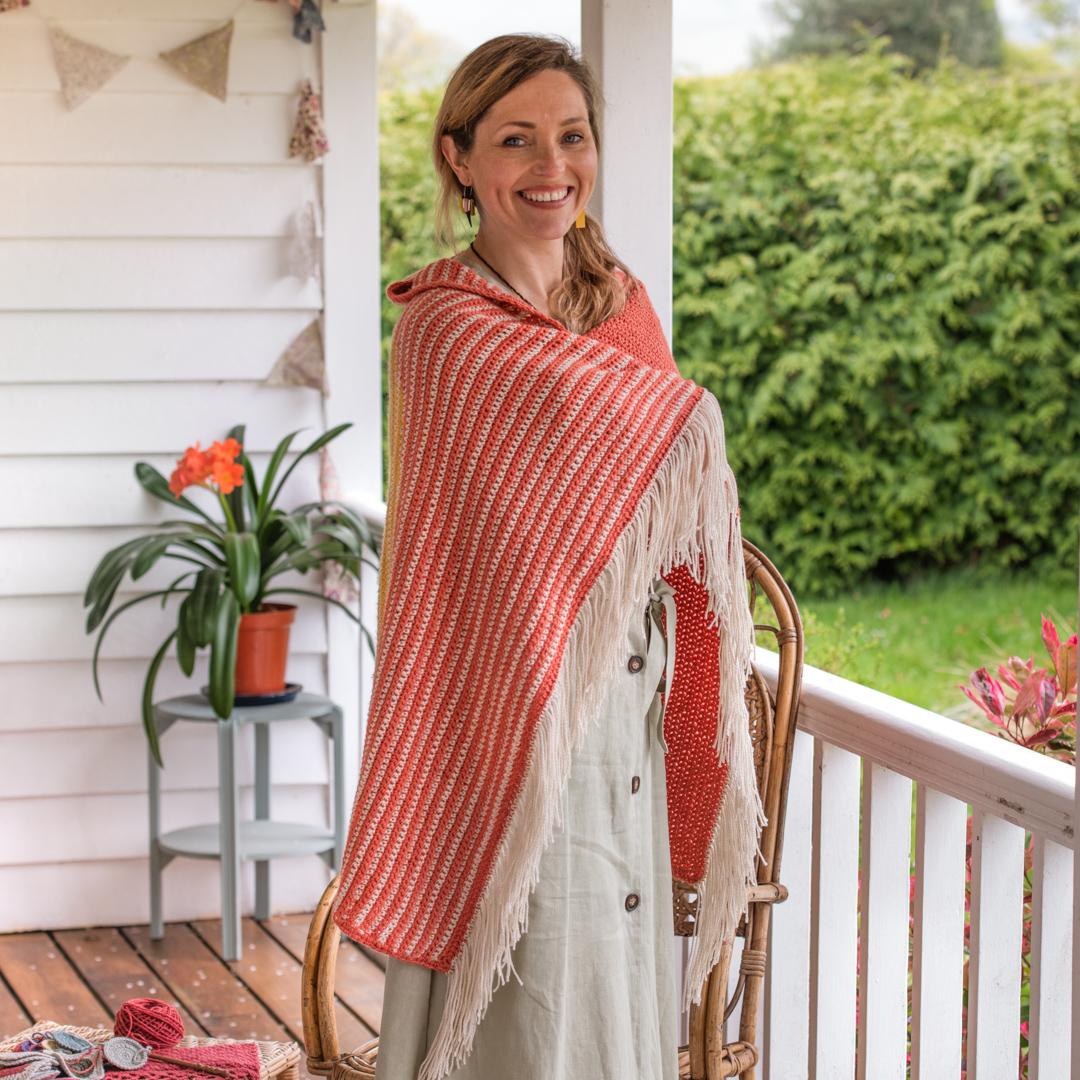 Designer April Gopwani's Rise and Set Blanket is inspired by the warm tones of the rising and setting sun. The crochet pattern uses a colorwork chart to create the beautiful circular sun motif. The fringing details adds movement and additional texture.
