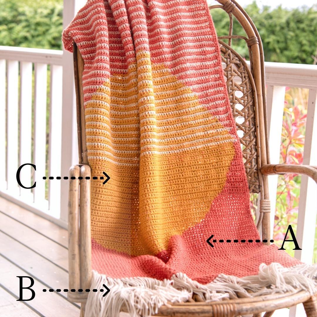 The photos show the blanket in the shades Flamingo (A), Blanca (B) and Buttercup (C).